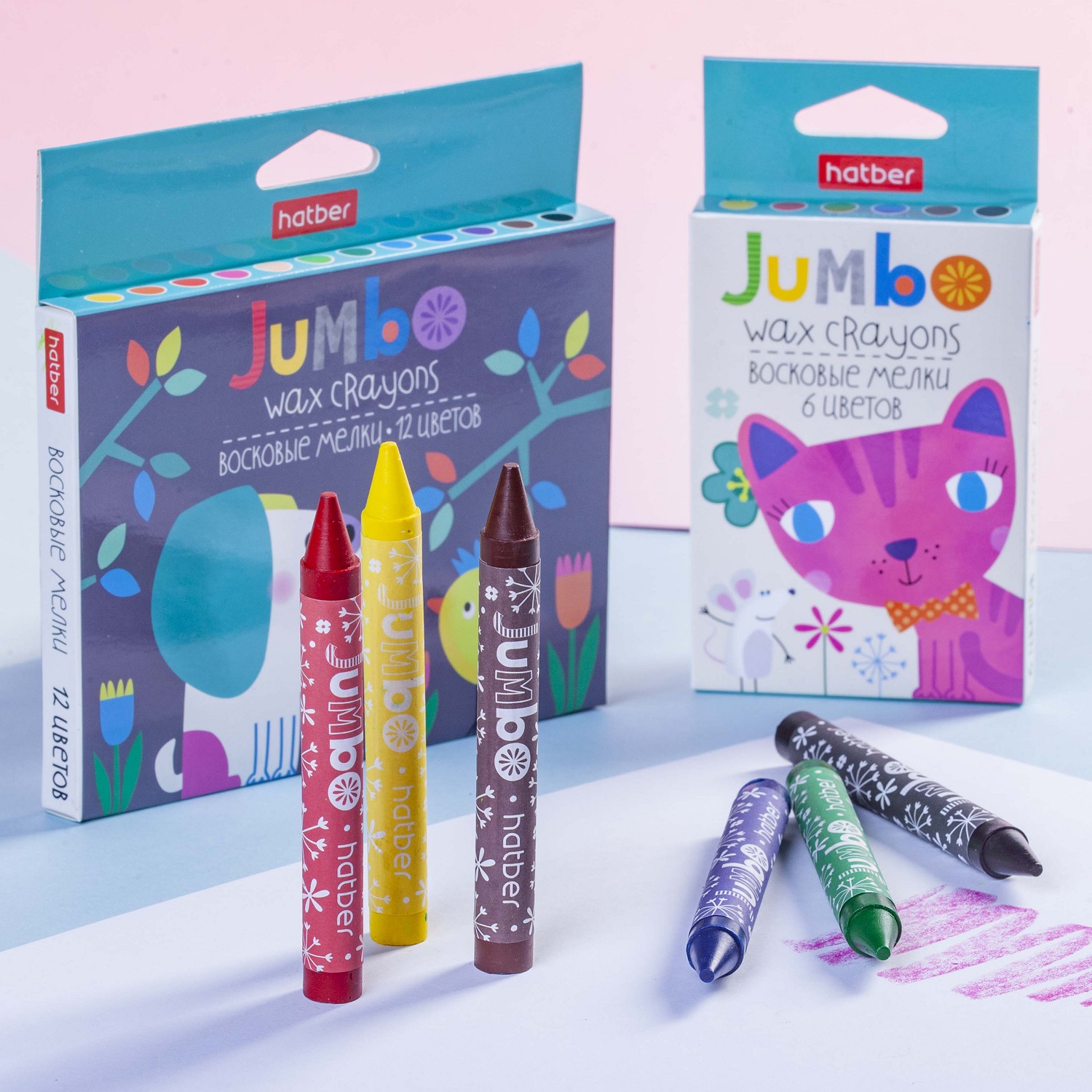 Для маленьких детей подходят утолщённые круглые восковые мелки JUMBO в наборах из 6 и 12 цветов.