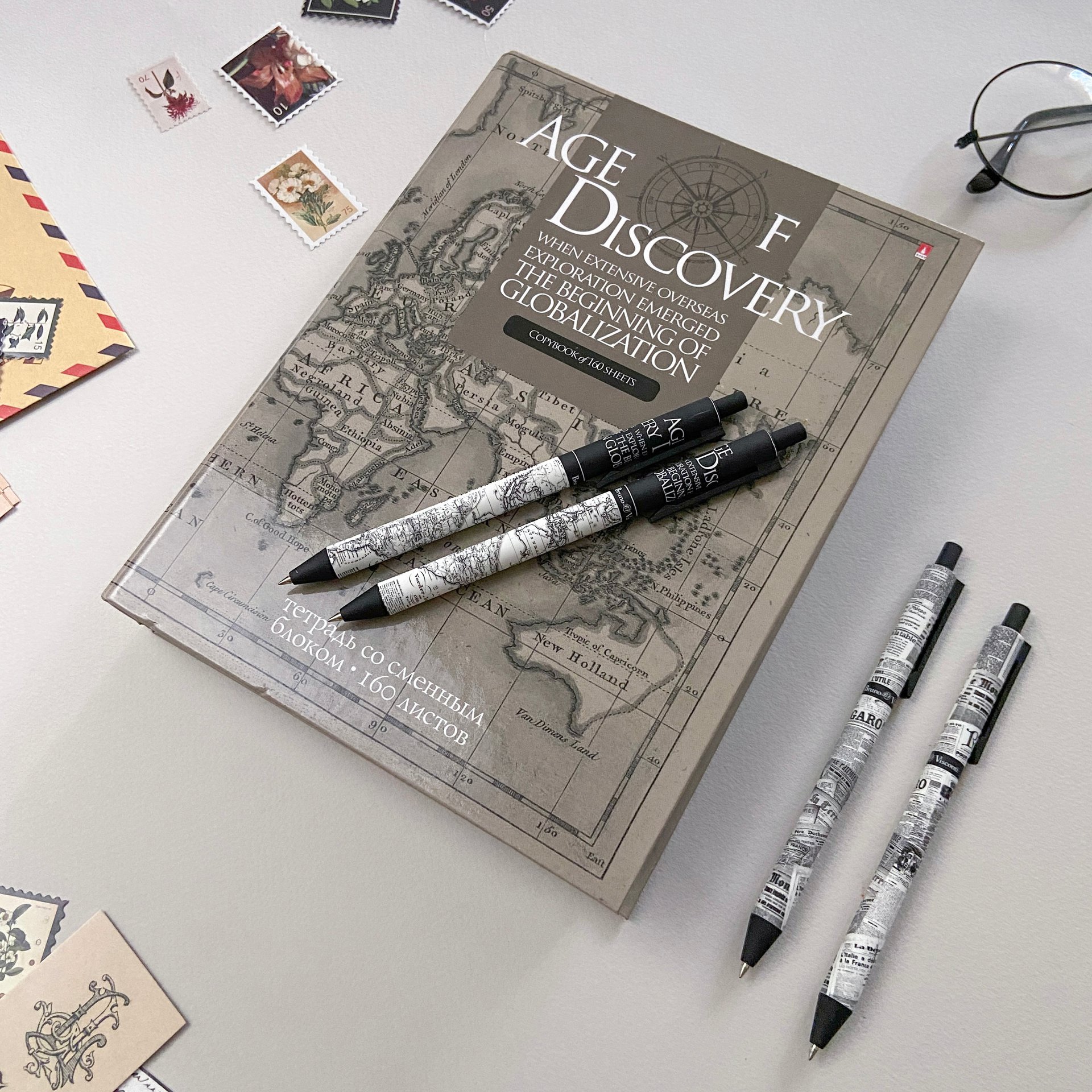 «Альт» и Bruno Visconti представляют тетрадь со сменным блоком «Эпоха открытий» и шариковую ручку «Карта мира». Вместе они образуют набор в едином стиле.