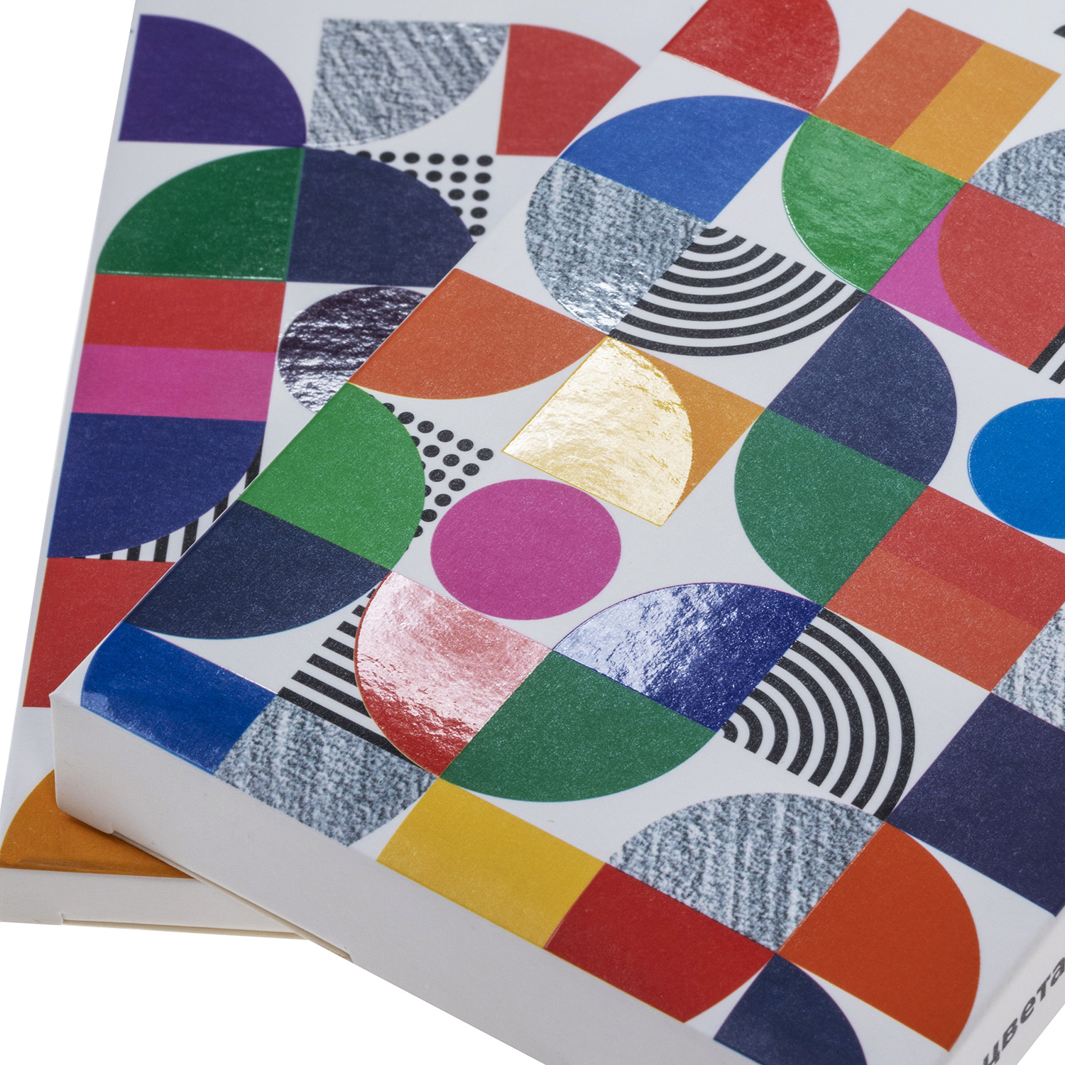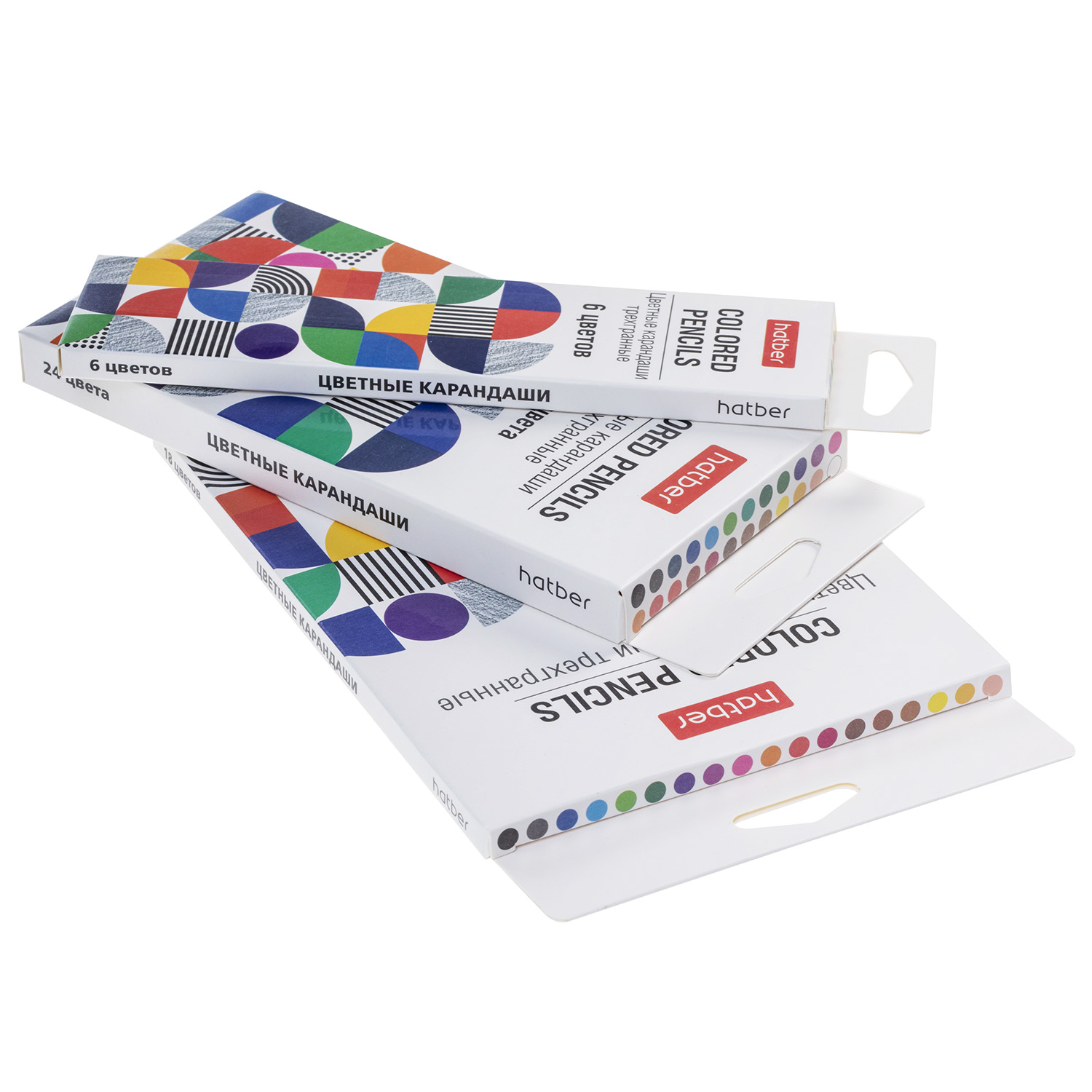 Упаковка карандашей из белого картона, покрытого матовой ламинацией, с лаконичным дизайном в стиле баухаус — абстрактным геометрическим рисунком, элементы которого подчеркнуты выборочным лаком.
