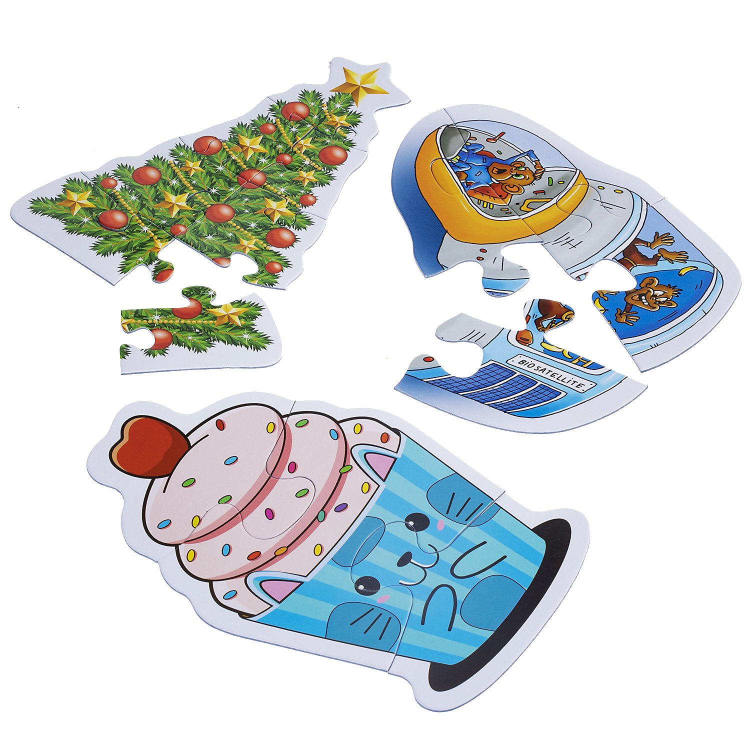 В одной коробке 4 пазла с разным количеством элементов, объединённых общей тематикой. Для начинающих фигурные пазлы на 3-4-5-6 и 5-6-7-8 элементов: красочная «Котоеда», забавные «Космические истории» и «Праздник к нам приходит» в лучших традициях Нового года.