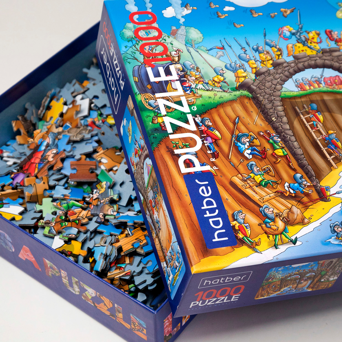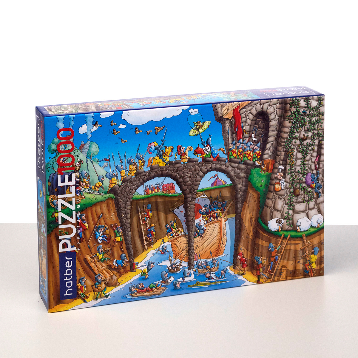 На второй новинке «Осадa крепости» на 1000 элементов предстает забавная сцена, полная иронии и неожиданных деталей. Мы видим рыцарей в доспехах, которые не особо рвутся в сражение, а находят минутку для созерцания и отдыха. Один из них даже умудрился удобно устроиться на плоту под мостом. Он, похоже, забыл о своей миссии и наслаждается отдыхом. Вода вокруг полна жизни!