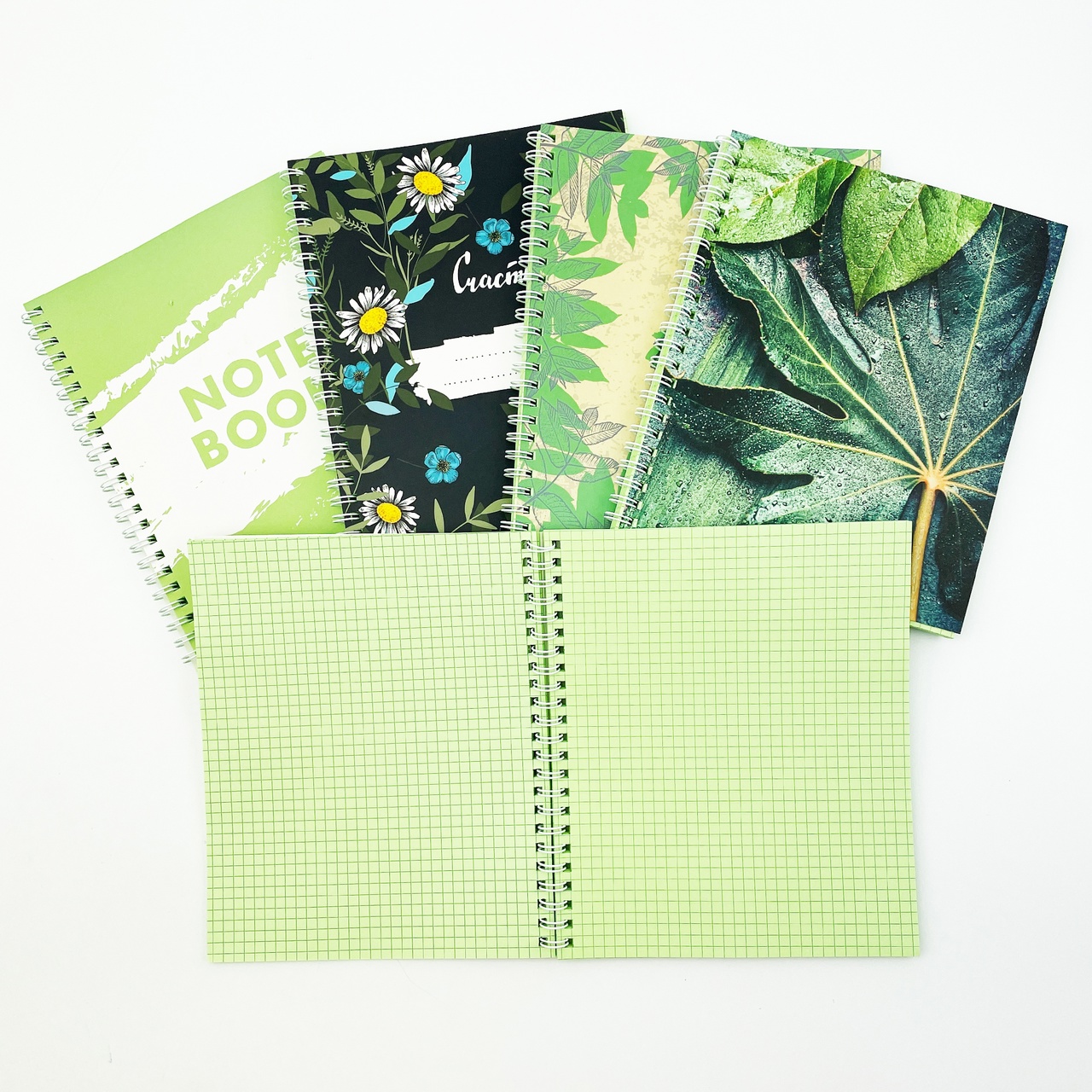 Внутренний блок: 96 листов, офсетная бумага (60 г/кв. м), зелёный внутренний блок. Линовка: клетка. Крепление: гребень, позволяет раскрывать тетрадь на 360 градусов.