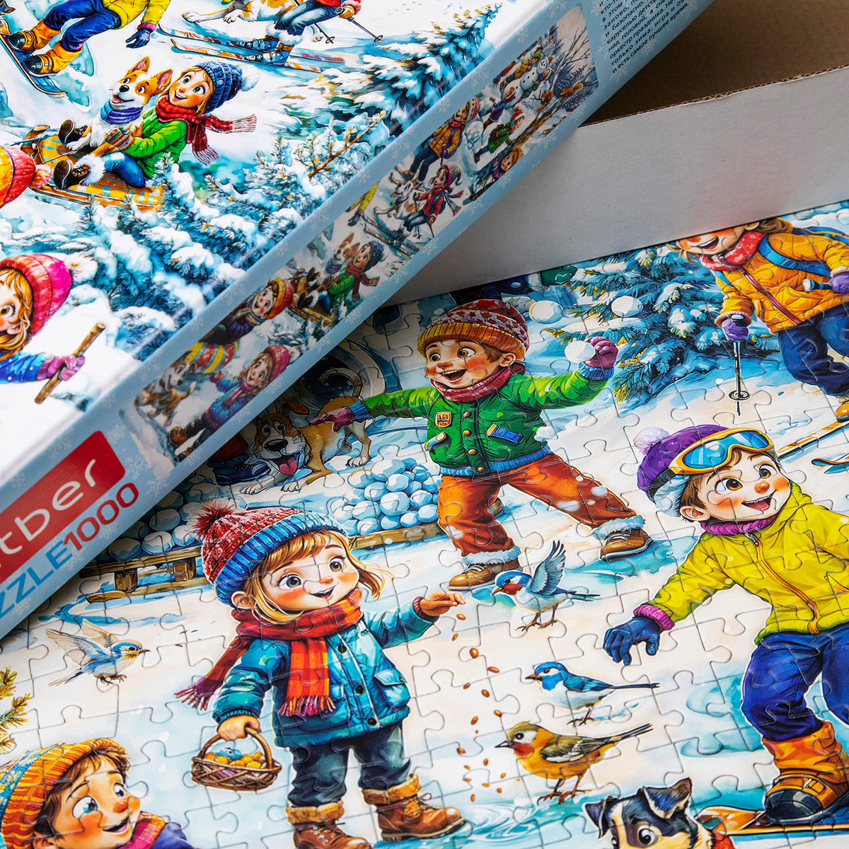 Пазл «Зимние радости» на 1000 деталей оживляет самые яркие воспоминания о беззаботном детстве — звонкий смех друзей, стремительные гонки на санках, первые лыжи, катание на коньках, снежные крепости и веселые игры до заката. Каждый кусочек этого пазла — словно кусочек сказочных приключений, где вокруг только друзья, задор и ощущение свободы. Здесь дружба крепнет в снежных битвах, новые истории рождаются у ледяной горки, а каждая минута наполнена радостью и волшебством зимних игр.