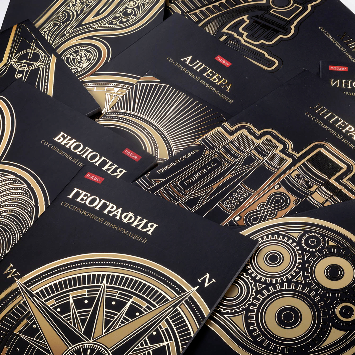 Обложки тетрадей имеют глубокий чёрный цвет, создавая эффектный контраст с объёмными золотыми элементами изображенных на ней предметов. Использование 3D-фольги делает эти изображения словно живыми при игре света, а приятная на ощупь матовая ламинация добавляет особой элегантности. Отличный вариант для тех, кто ценит красивые и стильные вещи.
