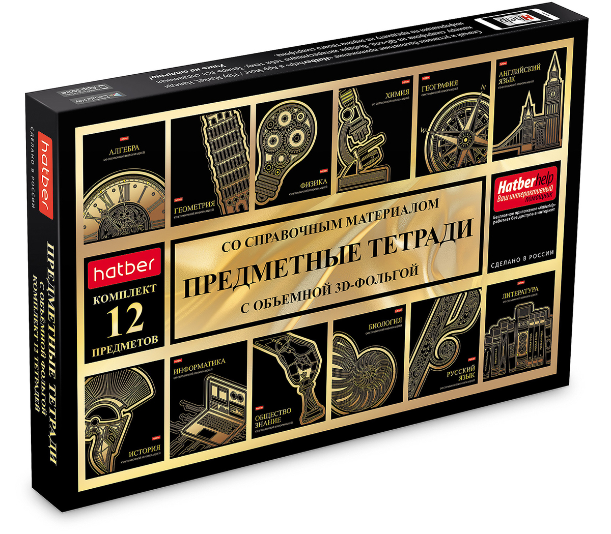 Серия «Золотые детали» А5-формата 46 листов состоит из двенадцати предметов: алгебра, русский язык, обществознание, геометрия, английский язык, информатика, история, физика, биология, география, химия, литература.