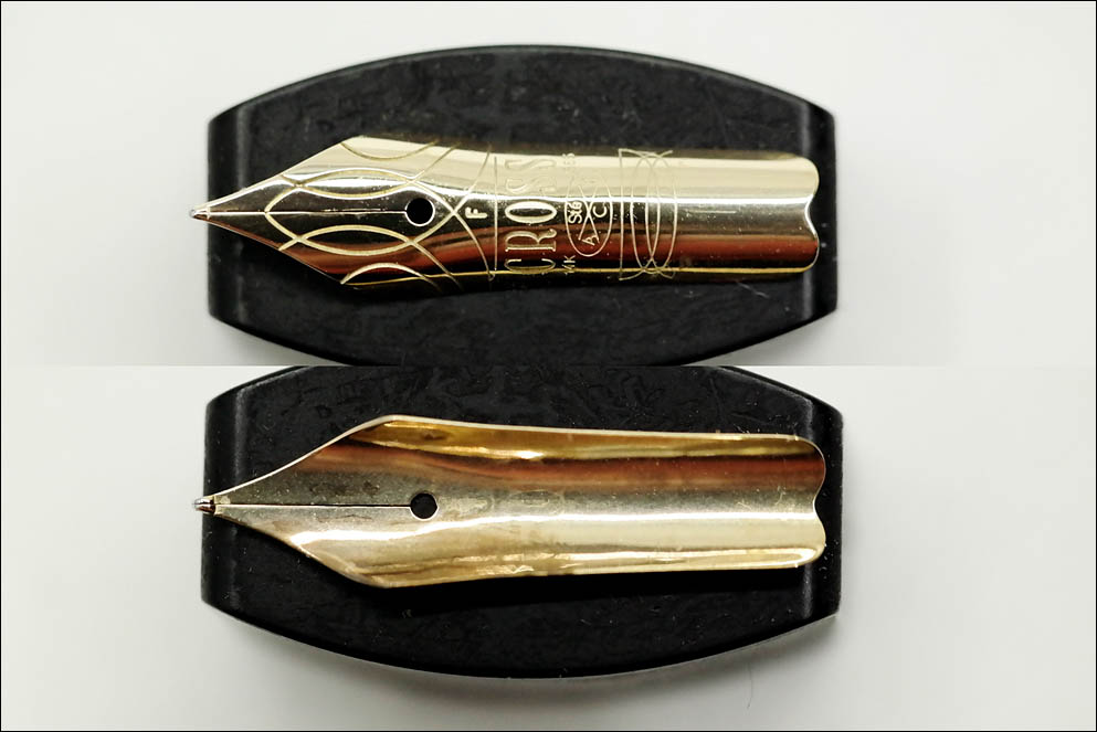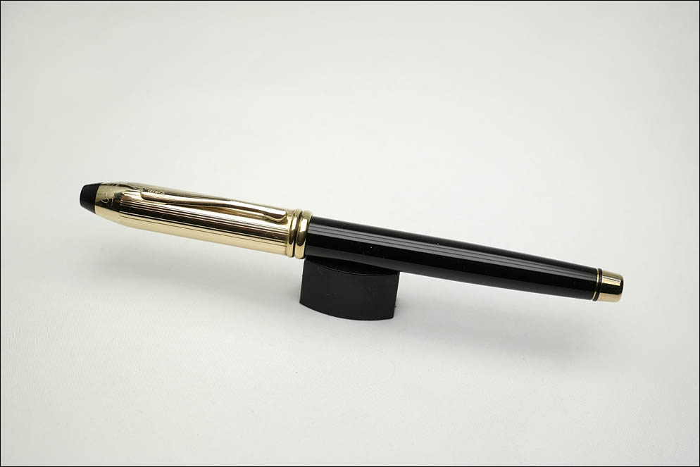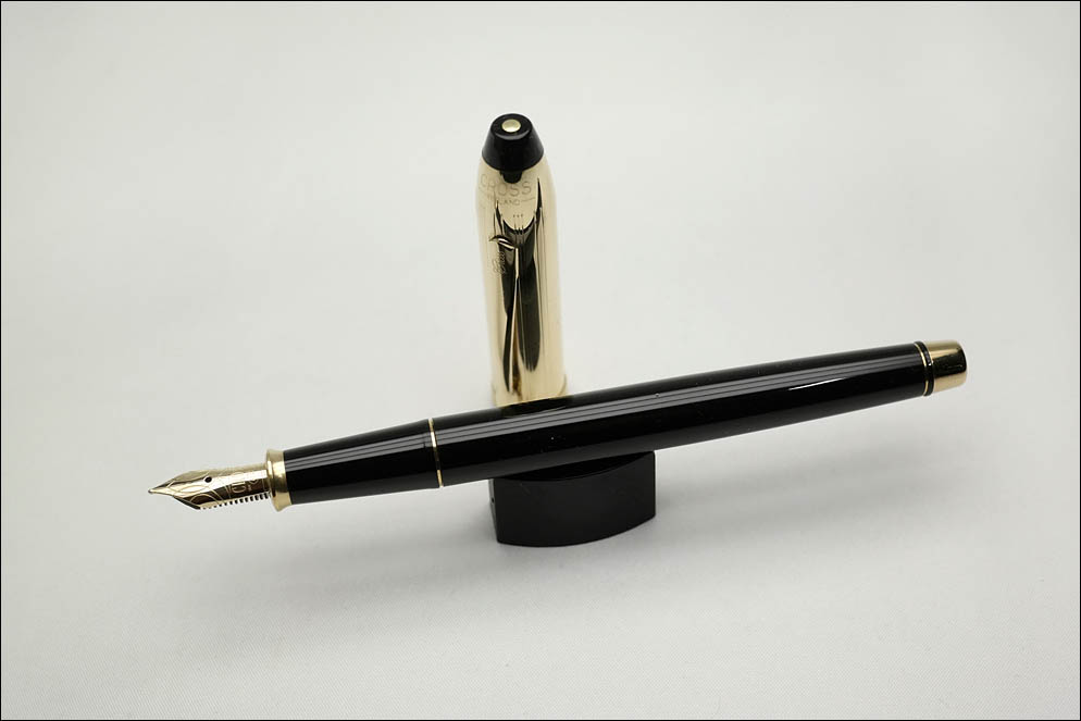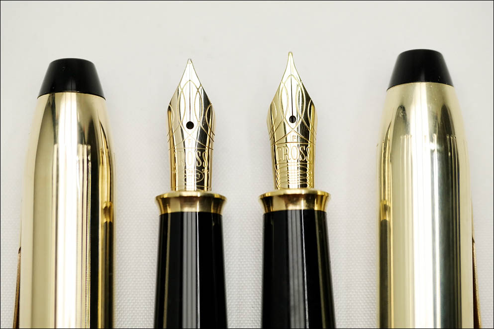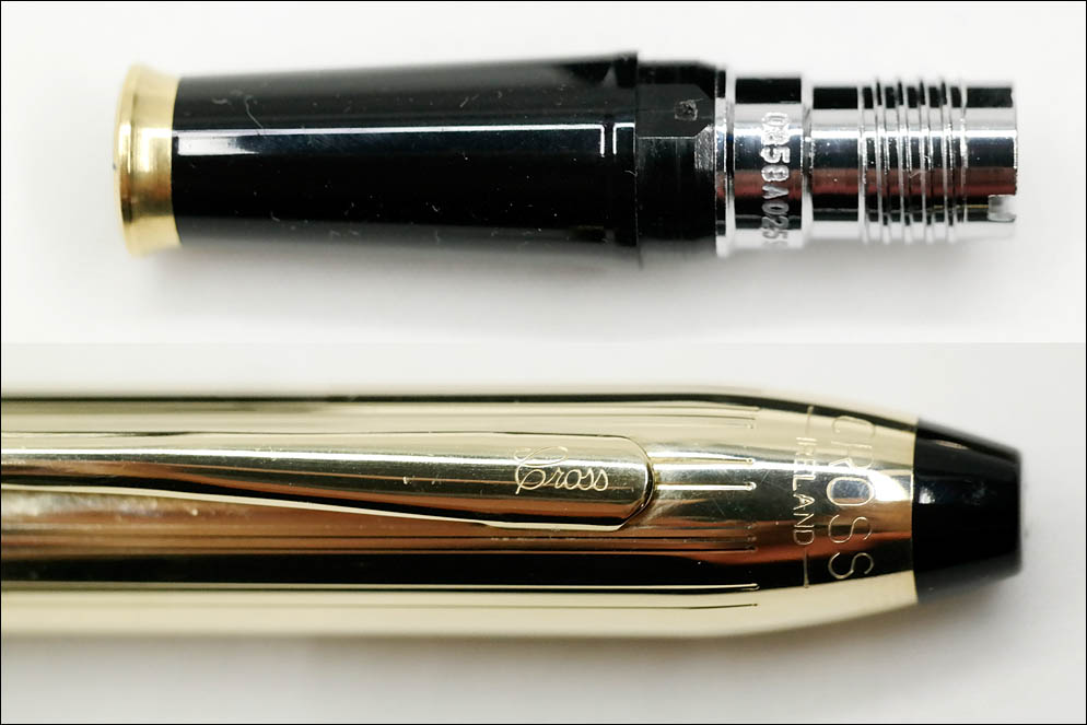 Перо: а вот собственно то, чем ручка отличается — золотое, 14-каратное перо, 5-го (5,5 мм) размера производства Pelikan. Перо очень гладкое и абсолютно жёсткое. Это перо является идентичным золотому перу от современной модели Pelikan Souveran M400. На перо нанесён фирменный ажурный узор, размерность пера F, имя компании CROSS, 14K, 585, ювелирное клеймо — Ste/A/T/C в овале и тот же спиральный узор, но всего на два витка.