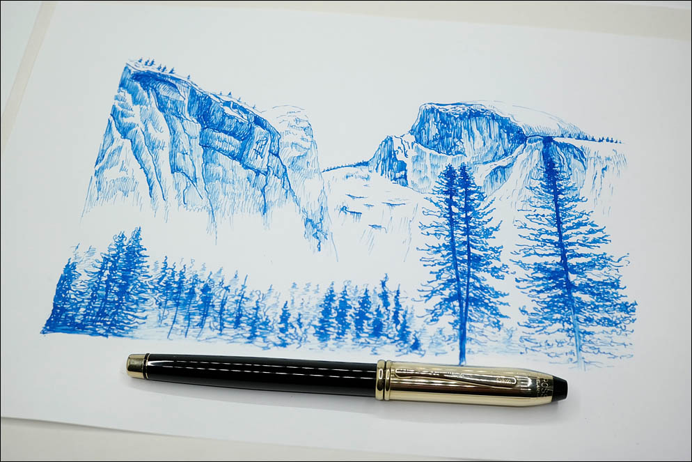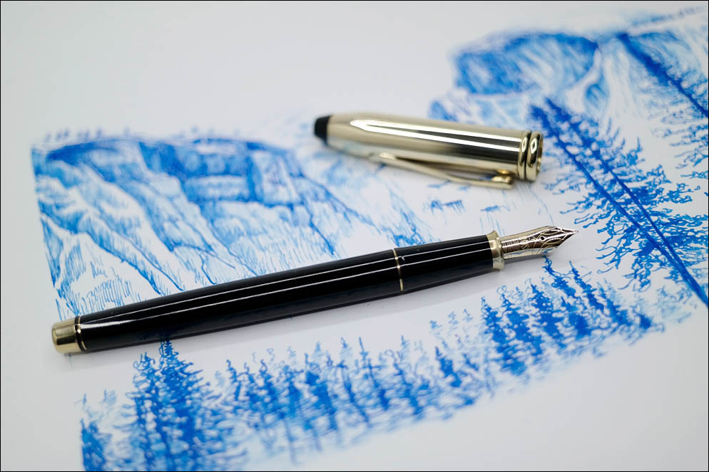 После промывки ручки оказалось, что между половинками была излишне большая щель, которая вместе с хорошо подающим фидером давала влажную и широкую линию. После настройки пера и полировки ручка была проверена в работе. Для адекватного сравнения я выбрал подобный сюжет и точно те же чернила, которыми тестировал аналогичную модель ранее.