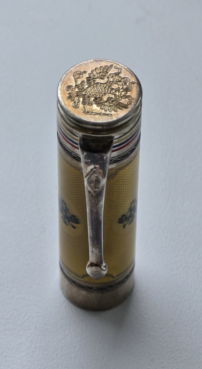 Отдельно расскажу о колпачке Romanoff. На нём присутствуют три кольца: белое, синее и красное — по цветам российского флага. На плоском серебряном наконечнике выгравирован императорский двуглавый орёл. Клип металлический, посеребрённый, о чём свидетельствует надпись. Традиционное слабое место серебряных Conway Stewart — покрытие уж очень быстро облазит при эксплуатации.