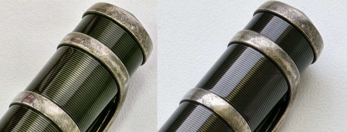 Интересный момент: ответная резьба в колпачке имеет только две «нитки» (винтовые канавки) из трёх. Такие решения периодически попадаются мне у Montblanc (например, из недавнего — на Writers Edition Thomas Mann), но, какой в этом практический смысл, я не знаю. Особенно учитывая, что ручки попроще из регулярных серий идут с полноценной трёхзаходной резьбой в колпачке.