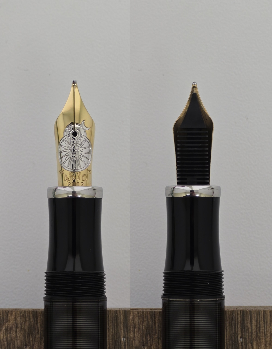 Ручка оснащена золотым пером 750-й пробы собственного производства, на котором изображены Солнце, Земля и Луна: выглядит симпатично. Фидер стандартный, пластиковый и, что примечательно, в старом дизайне, который был до 2002 года.