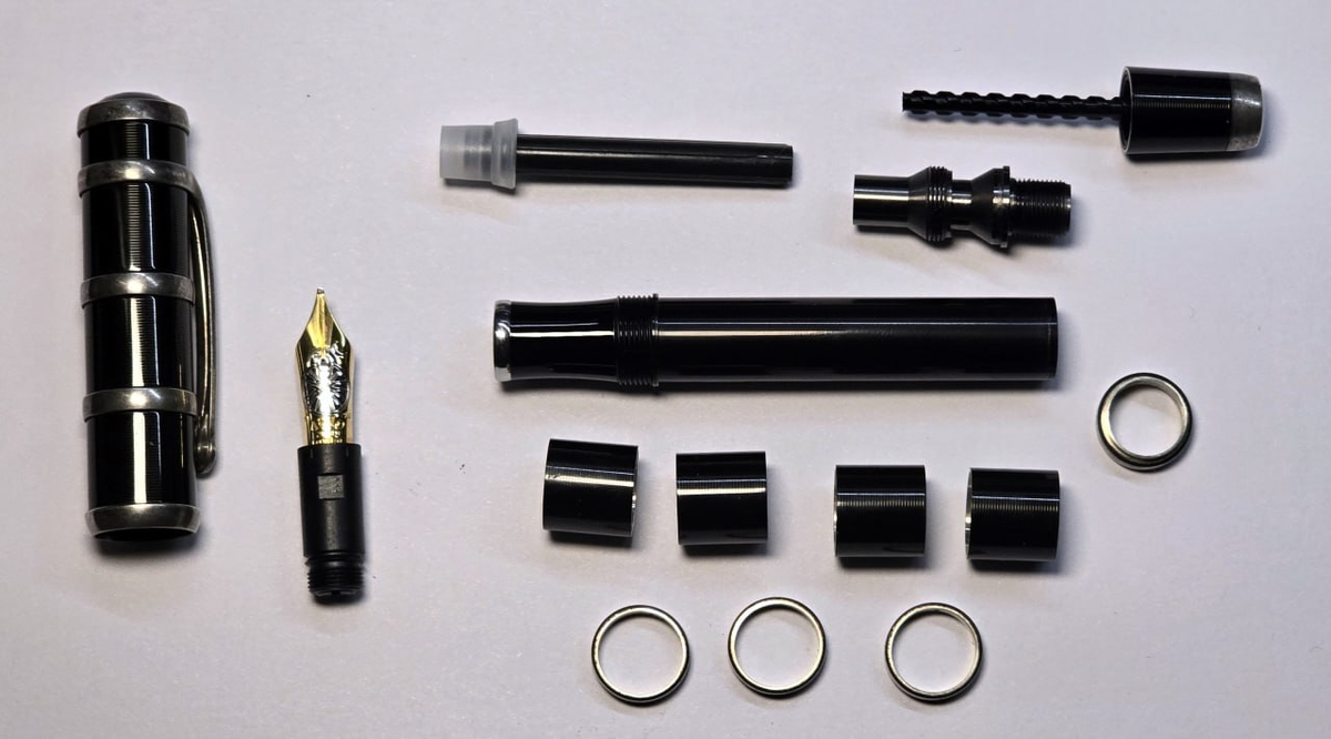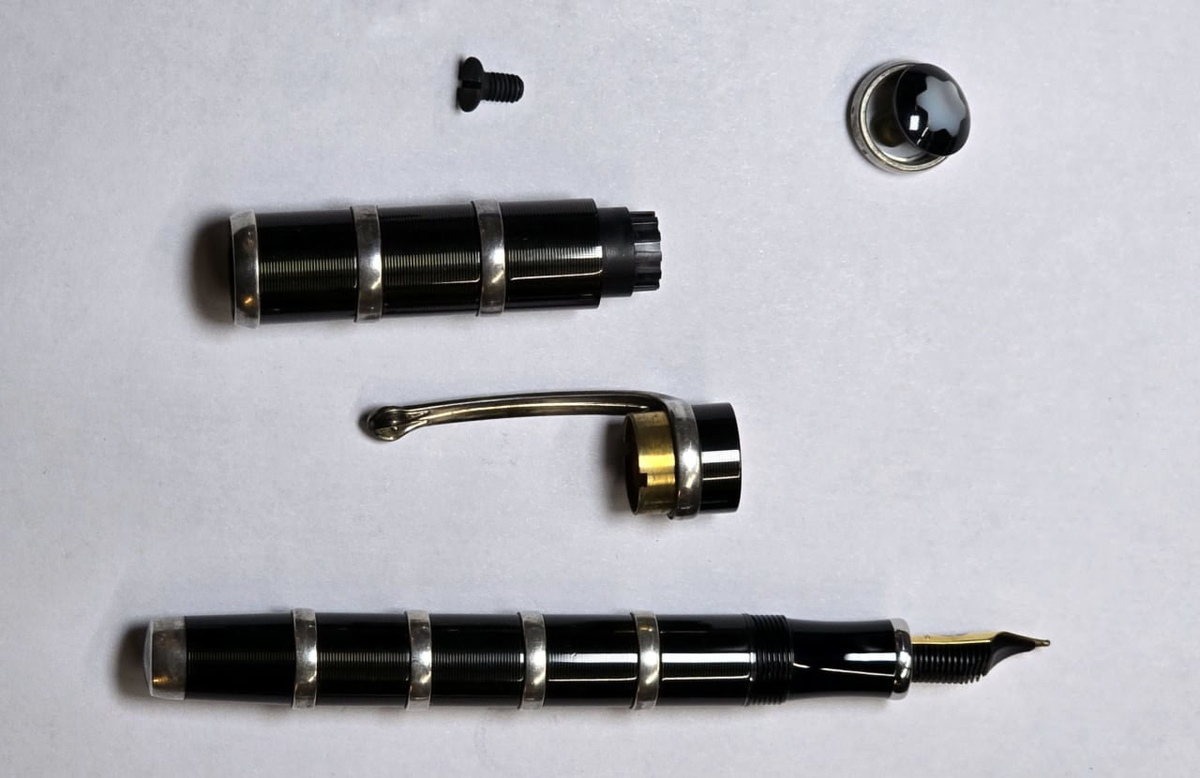 Кольца стянуты между собой прижимной гайкой поршневого механизма и навершием колпачка, занятно. Подобное мне уже встречалось в Montblanc Louis XIV, но там основа под оверлеем была из очень тонкого пластика. Здесь же использован металл: выглядит достаточно надёжно.
