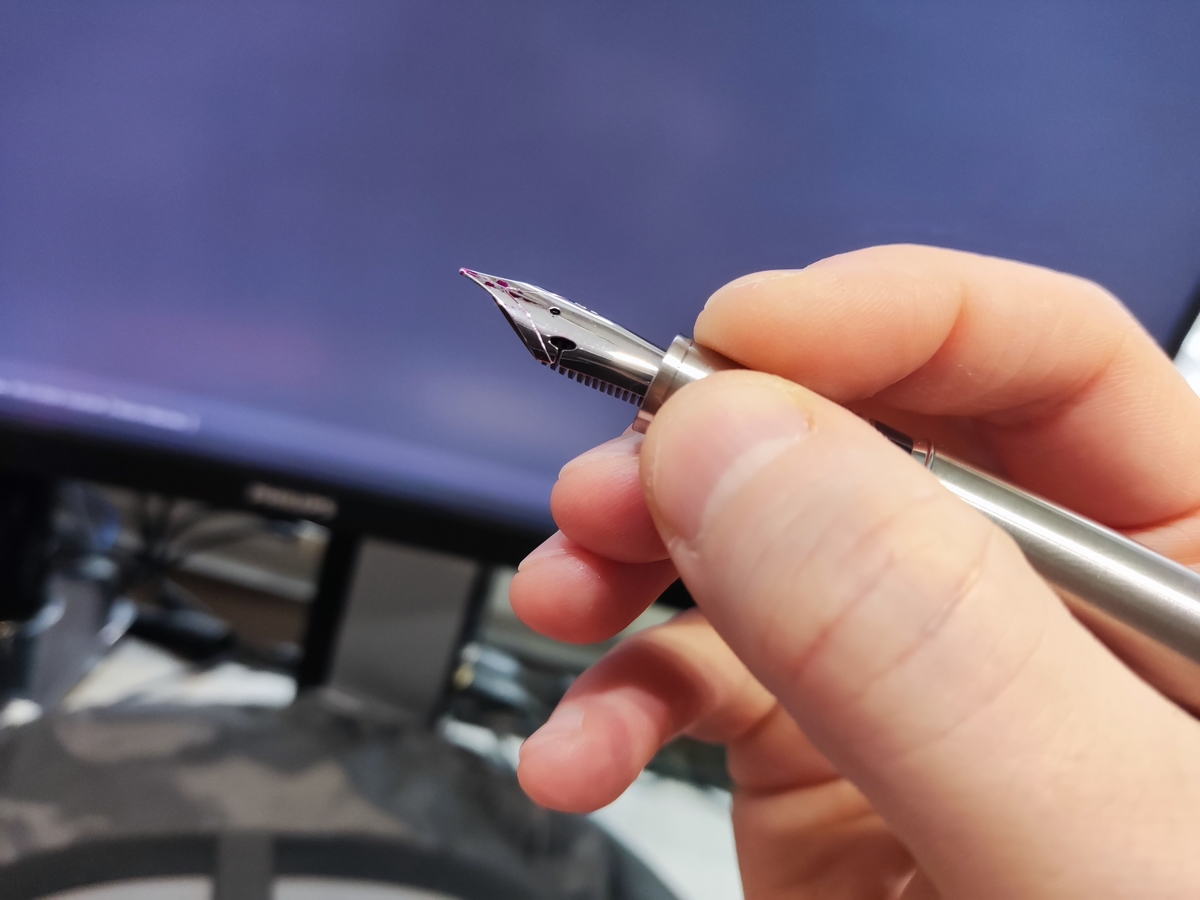 В ручке установлено стальное перо JoWo #6 Flexible. Относительно остальных частей инструмента оно смотрится вполне гармонично. На плечах пера сделаны вырезы, позволяющие половинкам раздвигаться сильнее своих менее гибких собратьев без каких-либо последствий. Однако шибко не радуйтесь, это не те дроиды, что вы ищете, — вернее, не настоящий флекс.