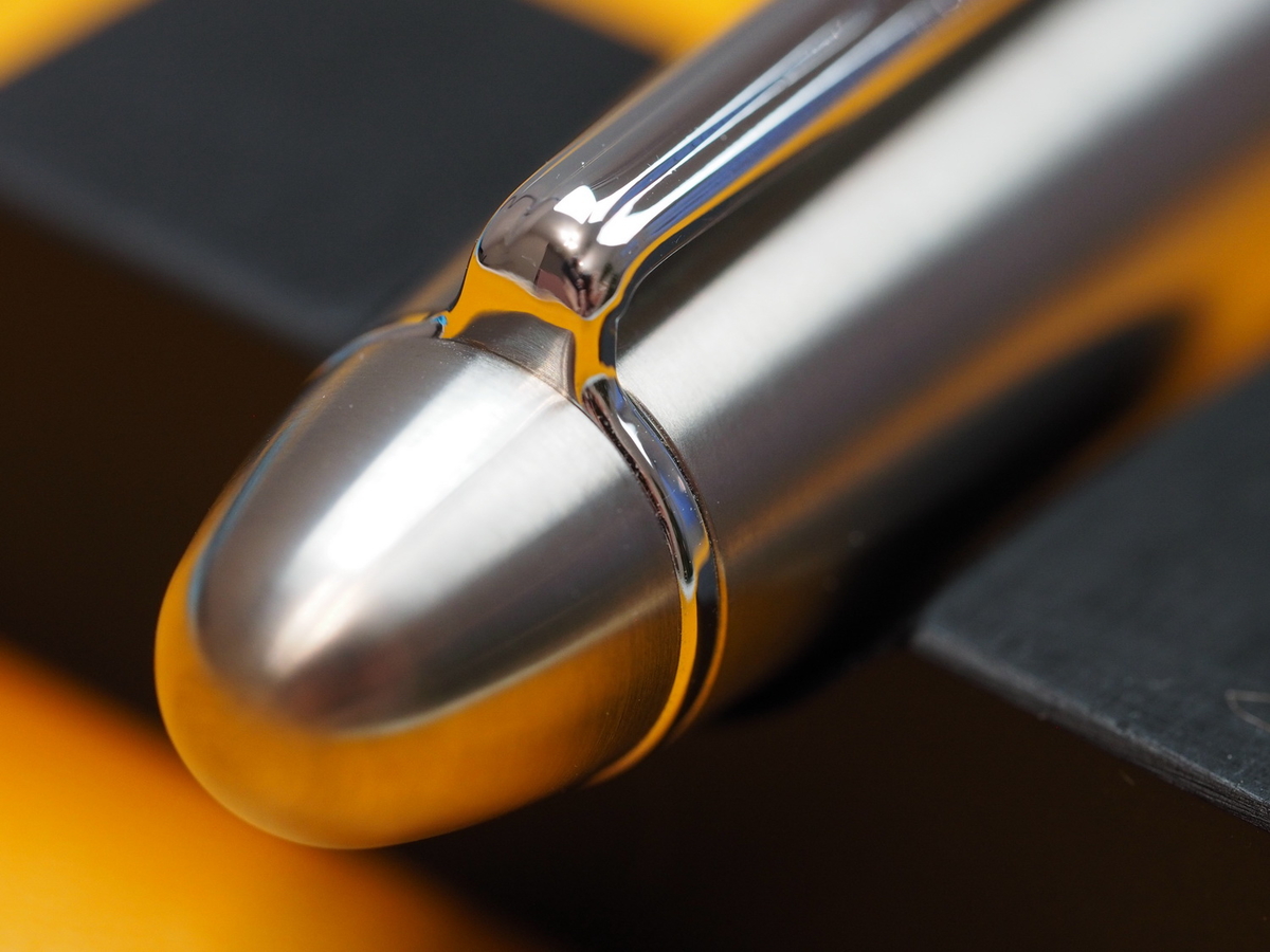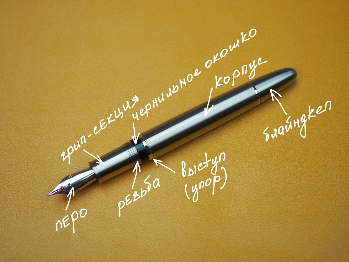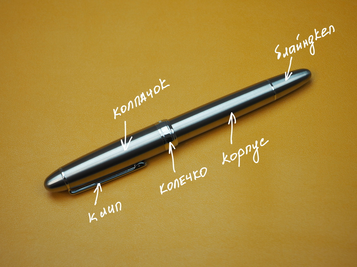 Согласно описанию и ощущениям, ахахах, корпус, грип-секция и колпачок выточены из титана (указывают solid titanium). Прозрачное окно контроля уровня чернил — акрил. Вся фурнитура — кольцо, которым оканчивается колпачок, упругий и блестящий клип, такие же блестящие, будто хромированные, уплотнительные колечки — сталь.