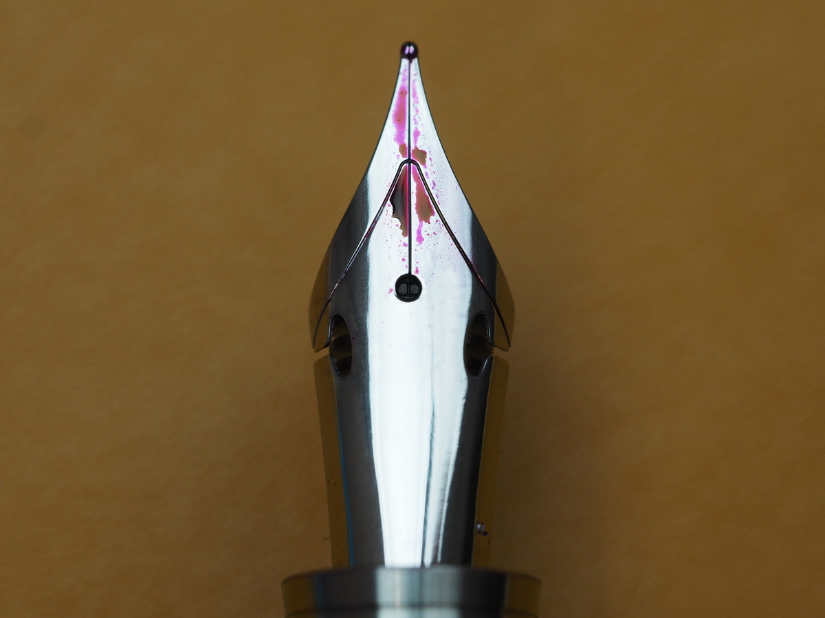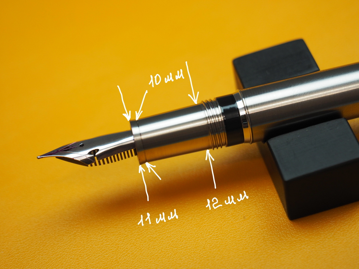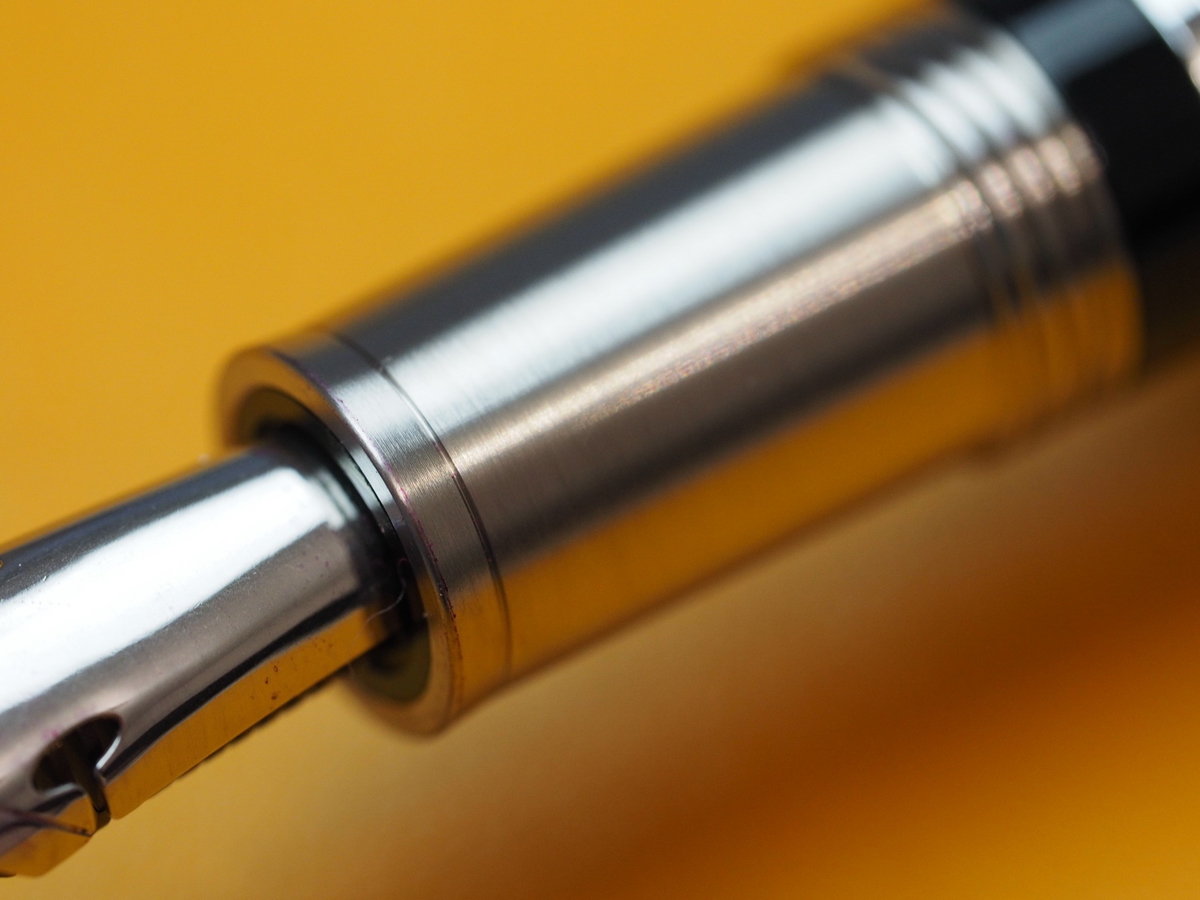 Грип-секция выше всяческих похвал. Может, дело в титане, может — в сатинировании, а может, в форме: плавно сужающийся к перу конус, заканчивающийся бортиком-упором, резко увеличивающимся в диаметре. Он нужен, чтобы пальцы не соскальзывали на перо. Однако секция цепкая и лично для меня с моим средним хватом удобная.