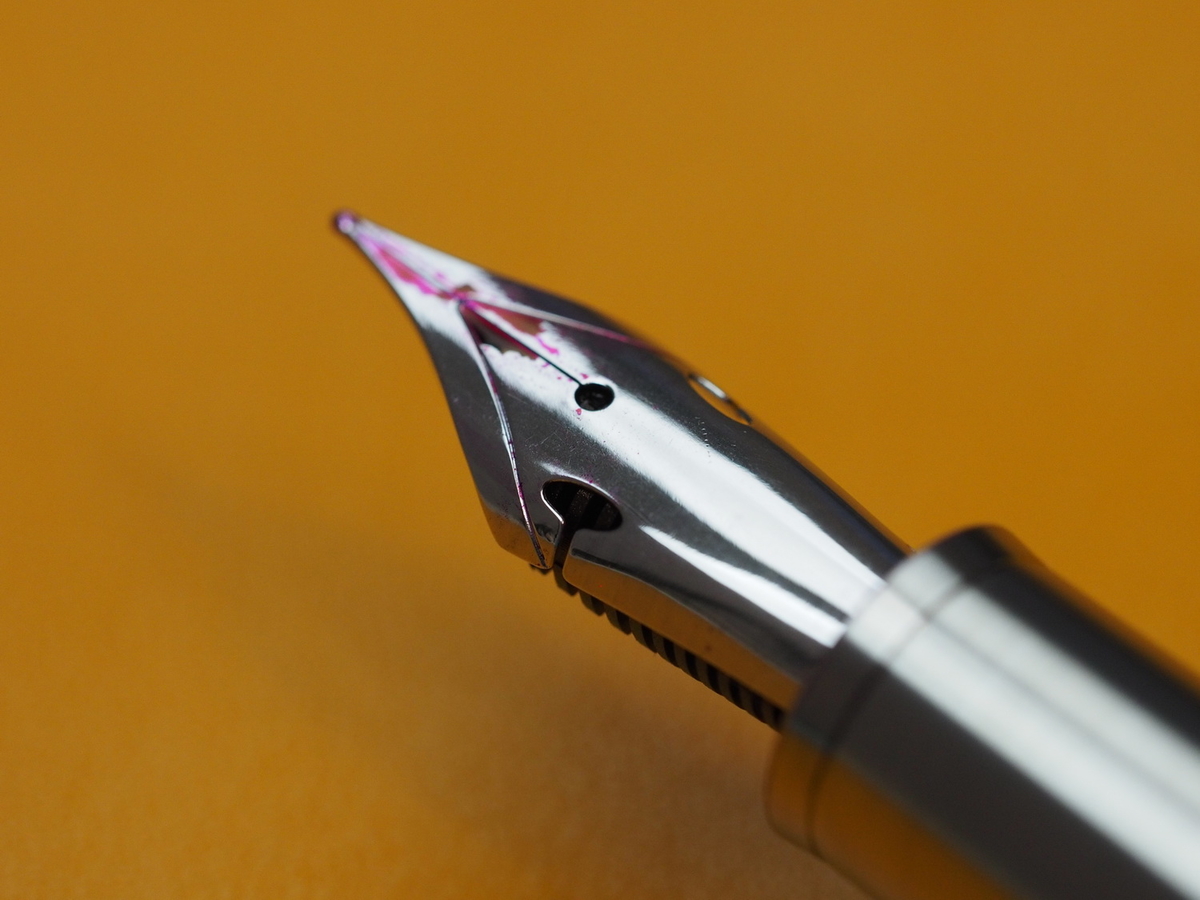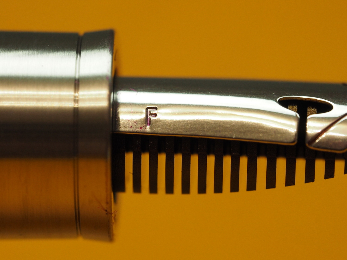 В остальном это вполне обычная европейская F-ка, позволяющая баловаться во время регулярного письма. Маркировка F указана на правом боку пера: