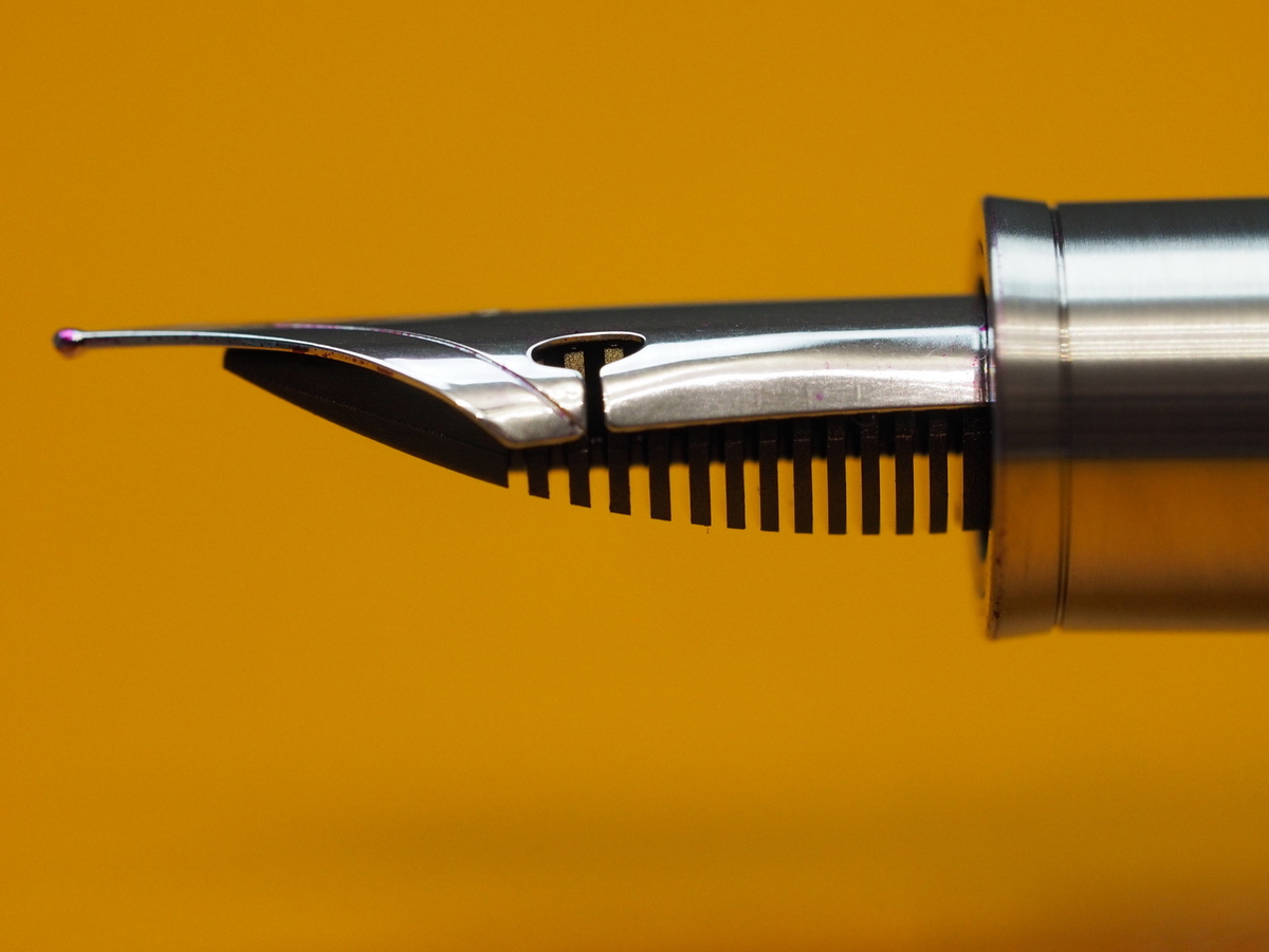 В ручке установлено стальное перо JoWo #6 Flexible. Относительно остальных частей инструмента оно смотрится вполне гармонично. На плечах пера сделаны вырезы, позволяющие половинкам раздвигаться сильнее своих менее гибких собратьев без каких-либо последствий. Однако шибко не радуйтесь, это не те дроиды, что вы ищете, — вернее, не настоящий флекс.