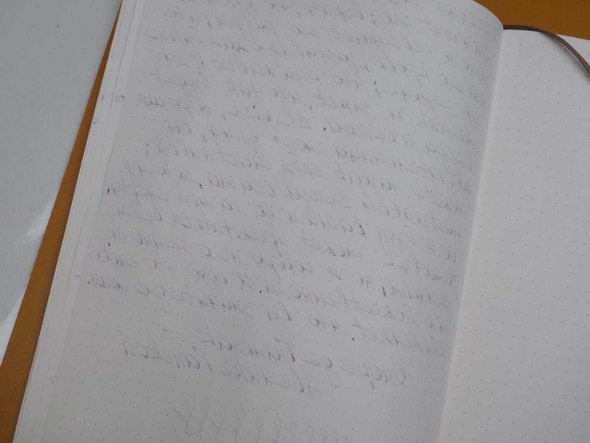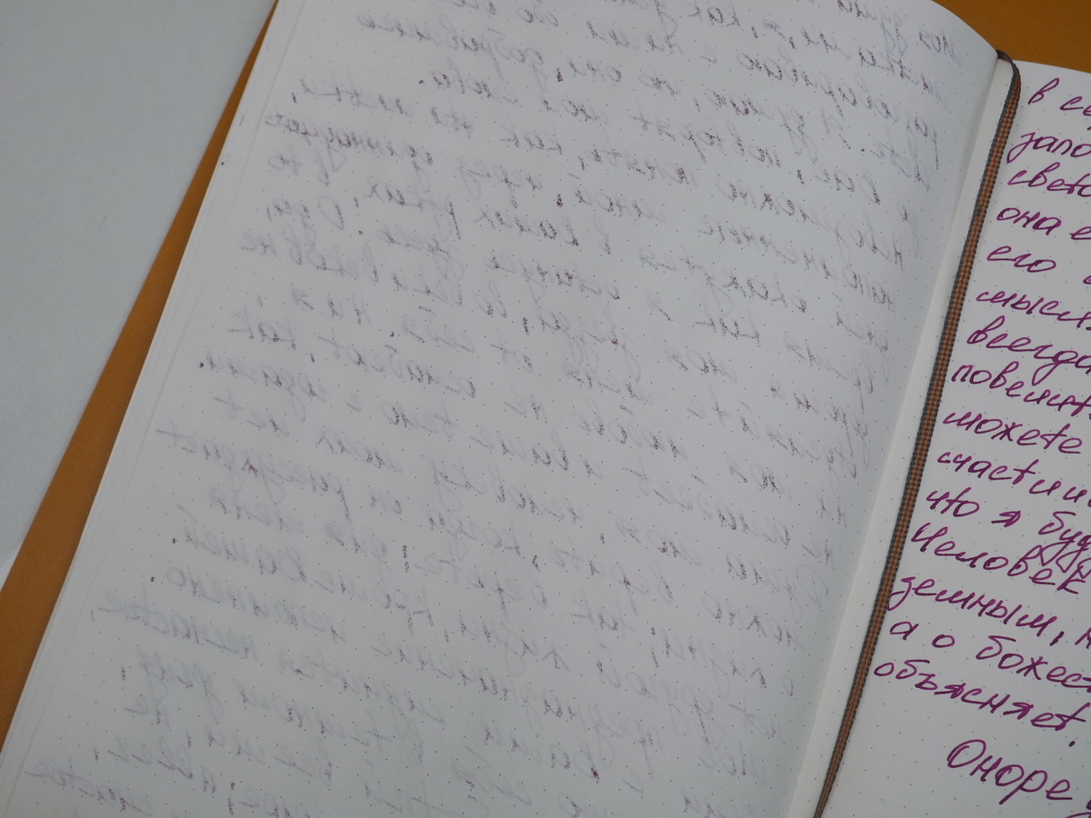Увы, далеко не каждой бумаге такое письмо по нраву. Так, в Leuchtturm1917, несмотря на плотность бумаги 80 г/м², чернила отрывались: был и блидинг (просачивание на обратную сторону листа), и гостинг (просвечивание на обратной стороне листа без просачивания), и какава с маслом.