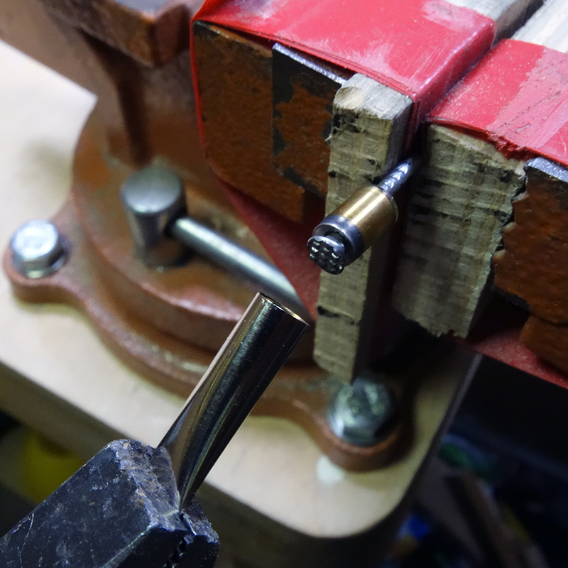 Во второй заход я забил втулку в корпус через деревянный шкант, распилил резервуар для стержней и вырвал втулку резервуара.