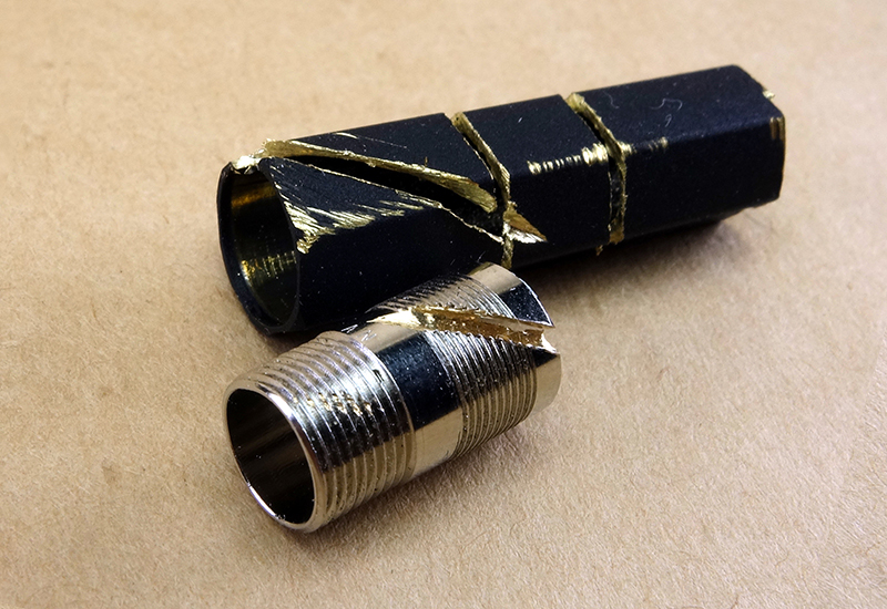 Сначала я добыл втулку, у которой с одной стороны резьба, с другой — «рёбрышки», которыми она распирает шестигранный корпус изнутри и поэтому там и держится.
