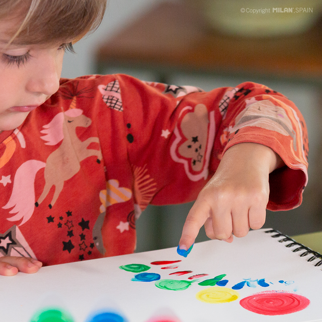 Пальчиковые краски Milan обладают приятной консистенцией, с ними можно рисовать как пальцами, так и кисточками, использовать их для создания текстуры на поверхностях и печати штампами. Пальчиковые краски выпускаются в 6 цветах. Время высыхания зависит от толщины нанесённого слоя. Пальчиковые краски Milan безопасны и подходят для детского творчества.