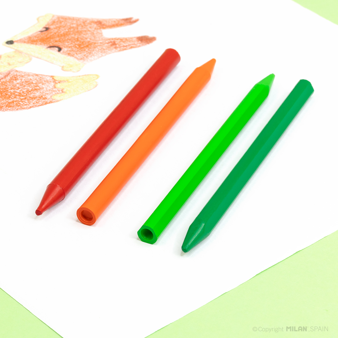 Цветные пластиковые карандаши Milan идеальны для детского творчества, потому что не пачкают руки и не имеют запаха, не бьются и не ломаются. Подходят для детей старше трёх лет. Насыщенные цвета карандашей легко смешиваются, образуя яркие оттенки. Если рисовать острым кончиком карандаша, получаются тонкие линии; обратной стороной — толстые. Большие области рисунка можно закрашивать, используя всю длину карандаша.