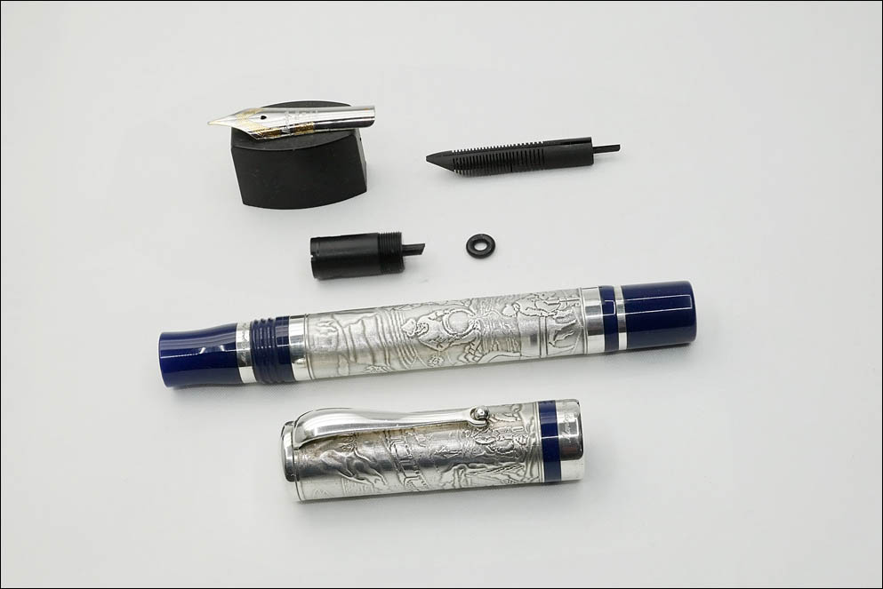 Фидер эбонитовый, что традиционно для «больших» Montegrappa, и располагается с пером на трении в пластиковом стакане, который с уплотнительным кольцом вкручивается в секцию ручки.