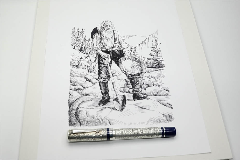 Поскольку эта модель посвящена исторической эпохе золотой лихорадки в США, на ручке выгравированы соответствующие сюжеты. На колпачке сложный ландшафт Калифорнии с горами, растительностью и морем, а также вехи технологического прогресса от повозок до шахт и прокладки железной дороги. На корпусе — мотивы колонизации и золотодобычи.