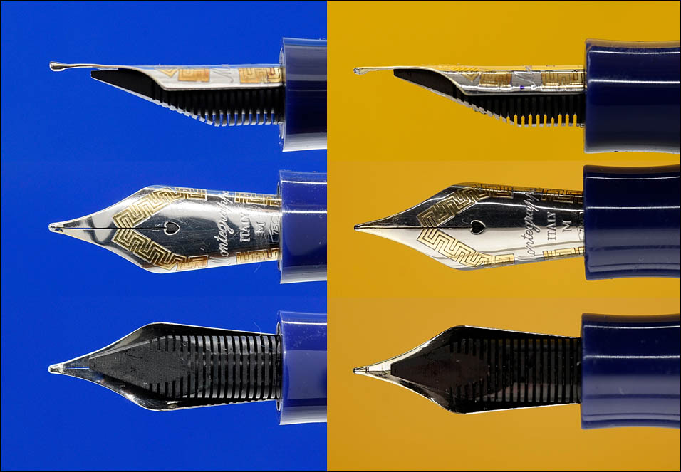 Классическое стандартное крупное перо размера 6, производимое компанией Bock для Montegrappa из 18-каратного золота и покрытое родием, за исключением фирменного греческого узора по контуру. Гладкое и мягкое, что позволяет немного варьировать ширину линии при письме. На нём нанесено: Montegrappa, ITALY, M, 750 в шестиугольнике и ювелирное клеймо ★1140MI.