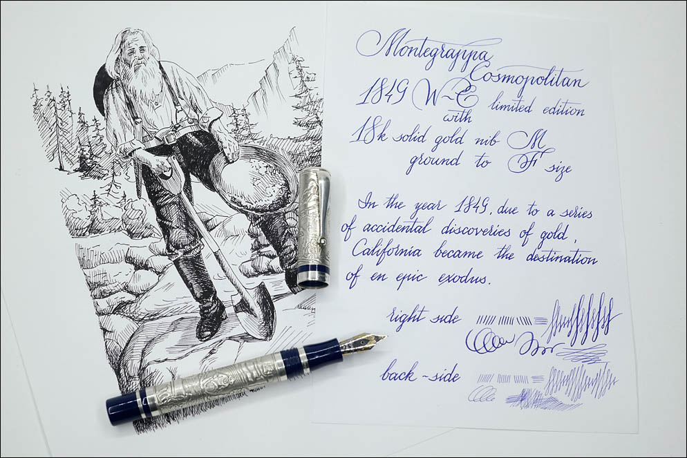 Изначально я исправил перо и переточил в размер F, потом заправил родными чёрными чернилами и протестировал. Линия показалась излишне влажной, к тому же вспомнил, что владелец пользуется чернилами Montblanc Royal Blue. Пришлось слить чёрные, ещё донастроить перо и заново заправить, но уже Montblanc. Из-за этого цвет чернил эскиза и теста отличаются.