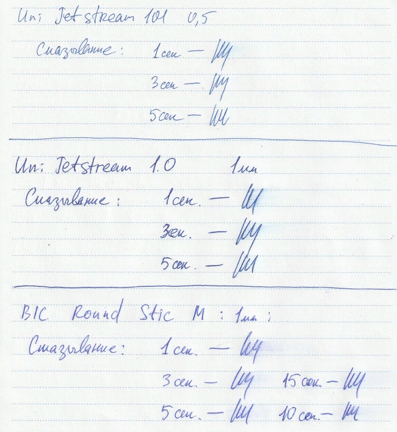 Понятно, что если подача чернил больше, то и размазать легче. Начертанное ручкой Uni-ball с самой обильной подачей не смазывается уже после трёх секунд, а с шариком 0,5 мм — и вовсе через пару.