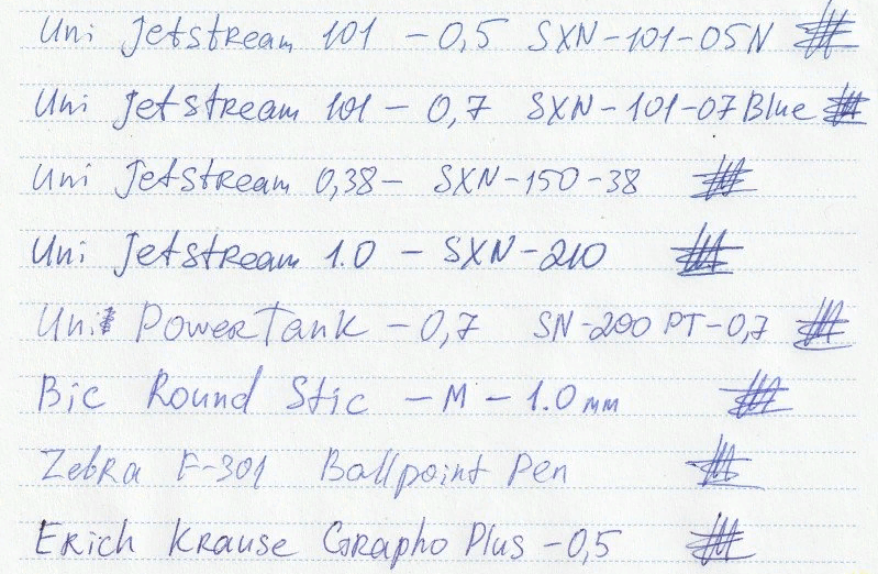 Uni Jetstream SXN-210 выигрывает у всех ручек по гладкости письма, равных реально нет! BIC Round Stic с шариком такого же диаметра требует ощутимо большего нажатия. Остальные модели Jetstream похожи по письму на Hatber и MC-Gold, но линию дают более равномерную. А вот Erich Krause потребовала большего давления на шарик, чтобы нормально писать.