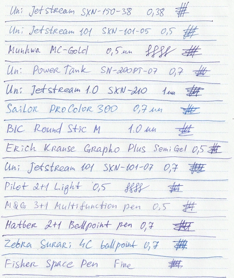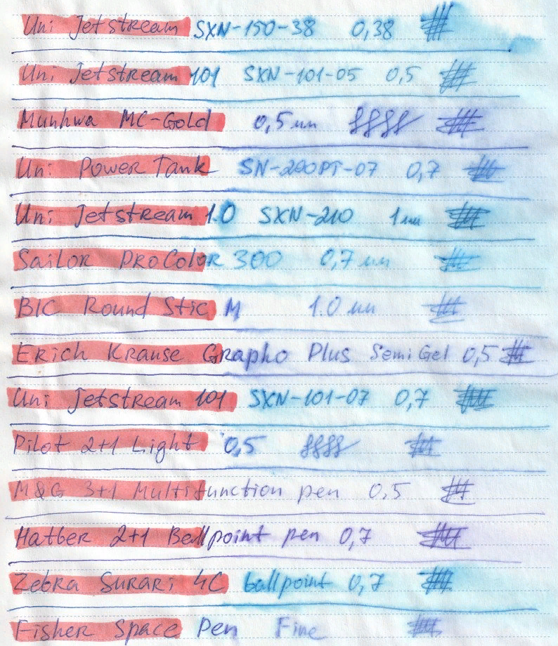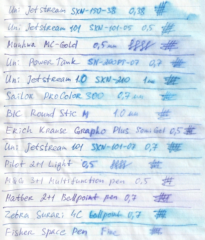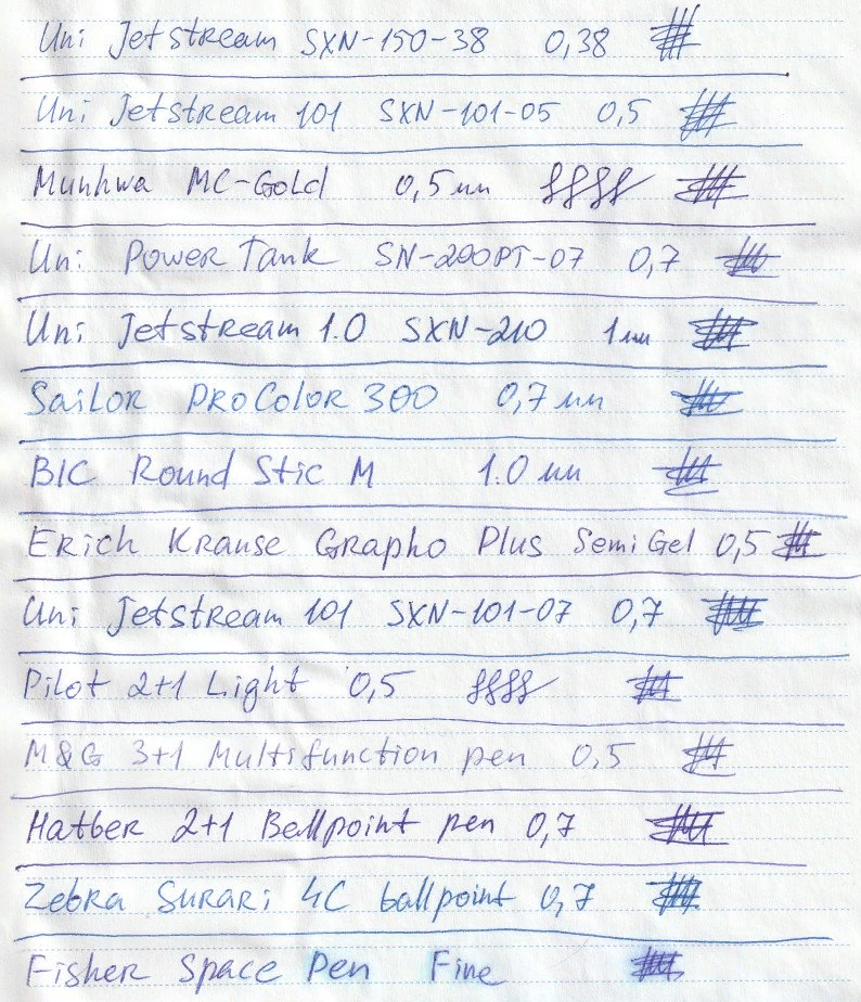 Ожидаемо Uni Jetstream хороши. MC-Gold пишет ярко, но откровенно льёт (чернила легко размазать). BIC, в принципе, отработала не менее равномерно, но уступает в насыщенности линии. Приятно удивила Hatber 2+1, разве что у неё есть проблемы с моментальным стартом.