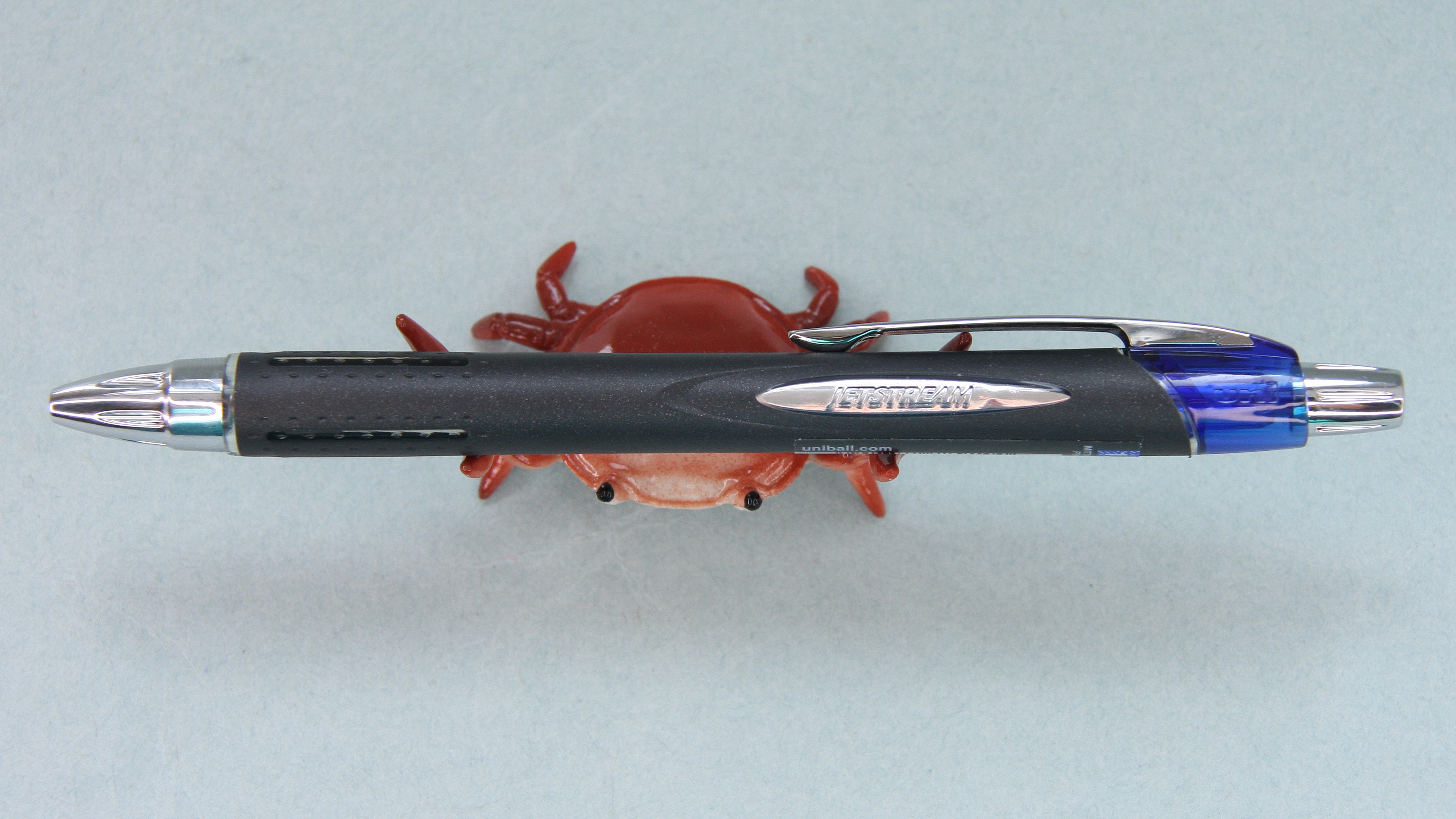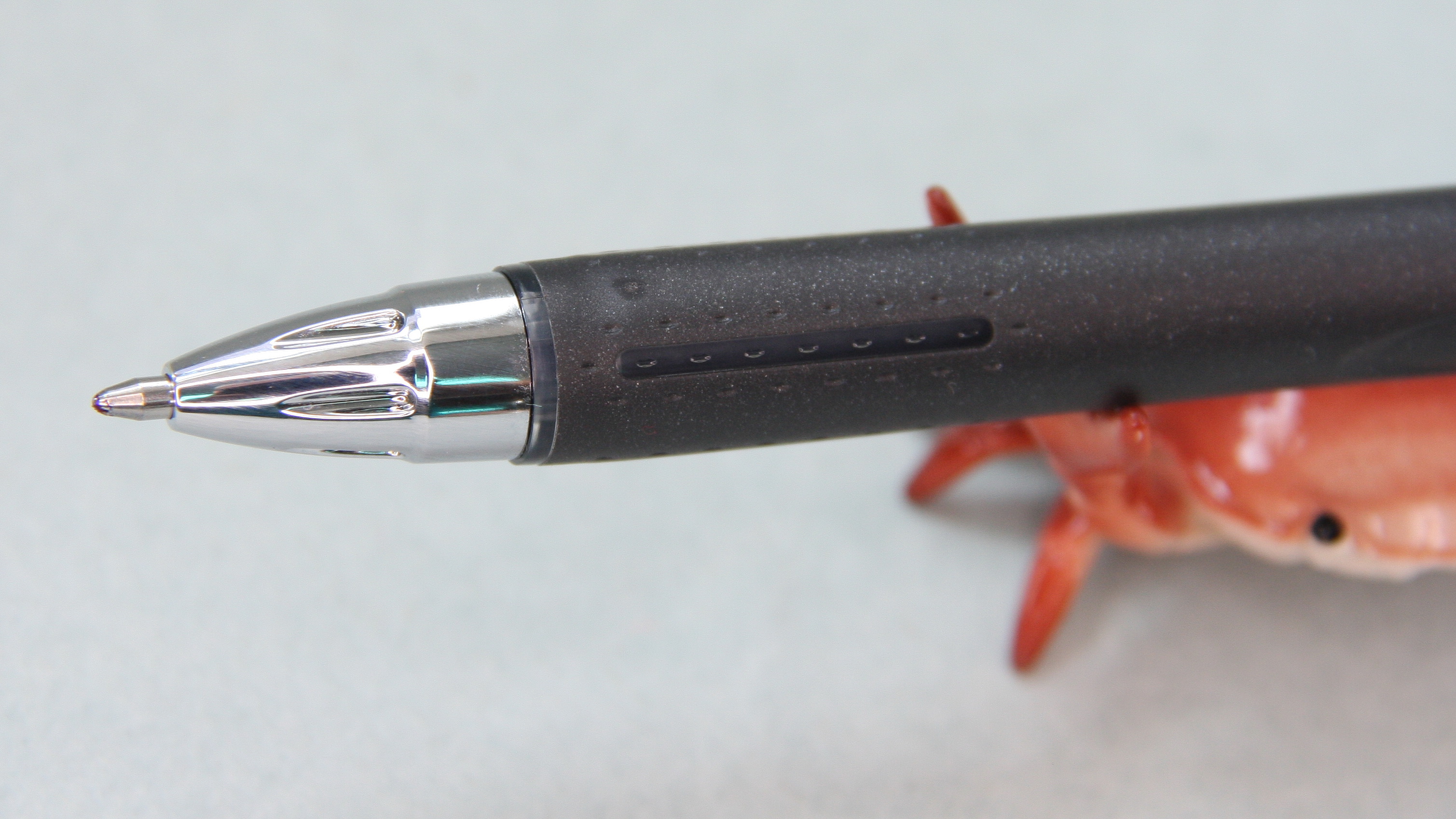 Корпус ручки остался полностью пластиковым, но он теперь обрезинен по всей поверхности и с металлическими акцентами, которые, по версии производителя, делают дизайн инструмента более премиальным в сравнении с той же Jetstream SXN-150.