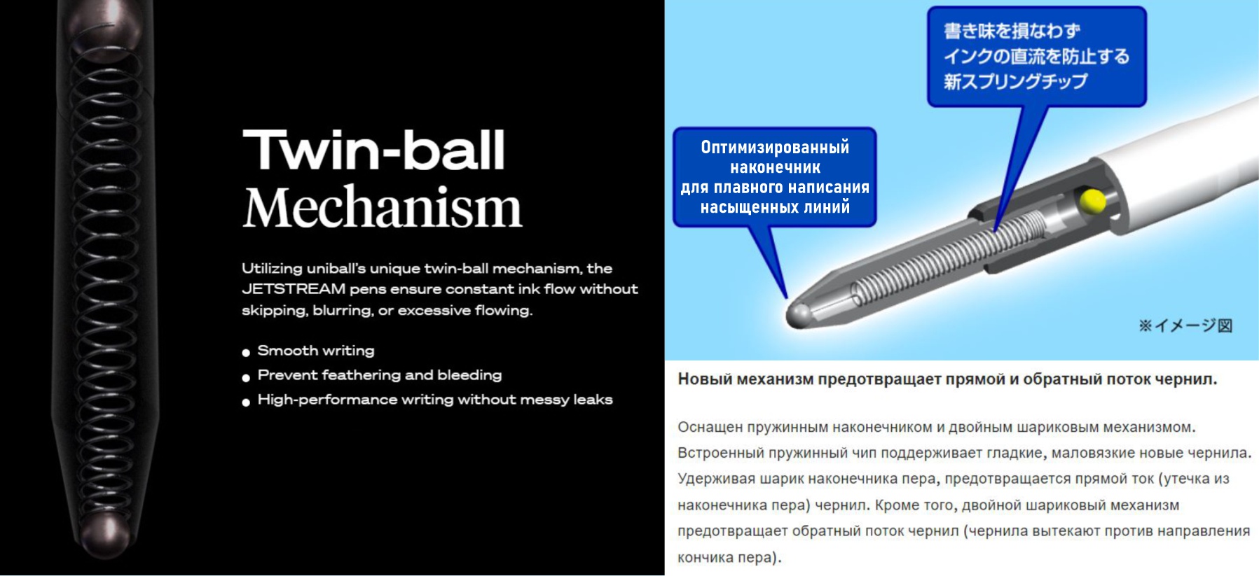 В некоторых (более дорогих) моделях Jetstream применяется технология Twin-ball mechanism (специальная система с двумя шариками и пружинкой), предотвращающая протекание чернил через пишущий узел и обеспечивающая их равномерную подачу во время письма.