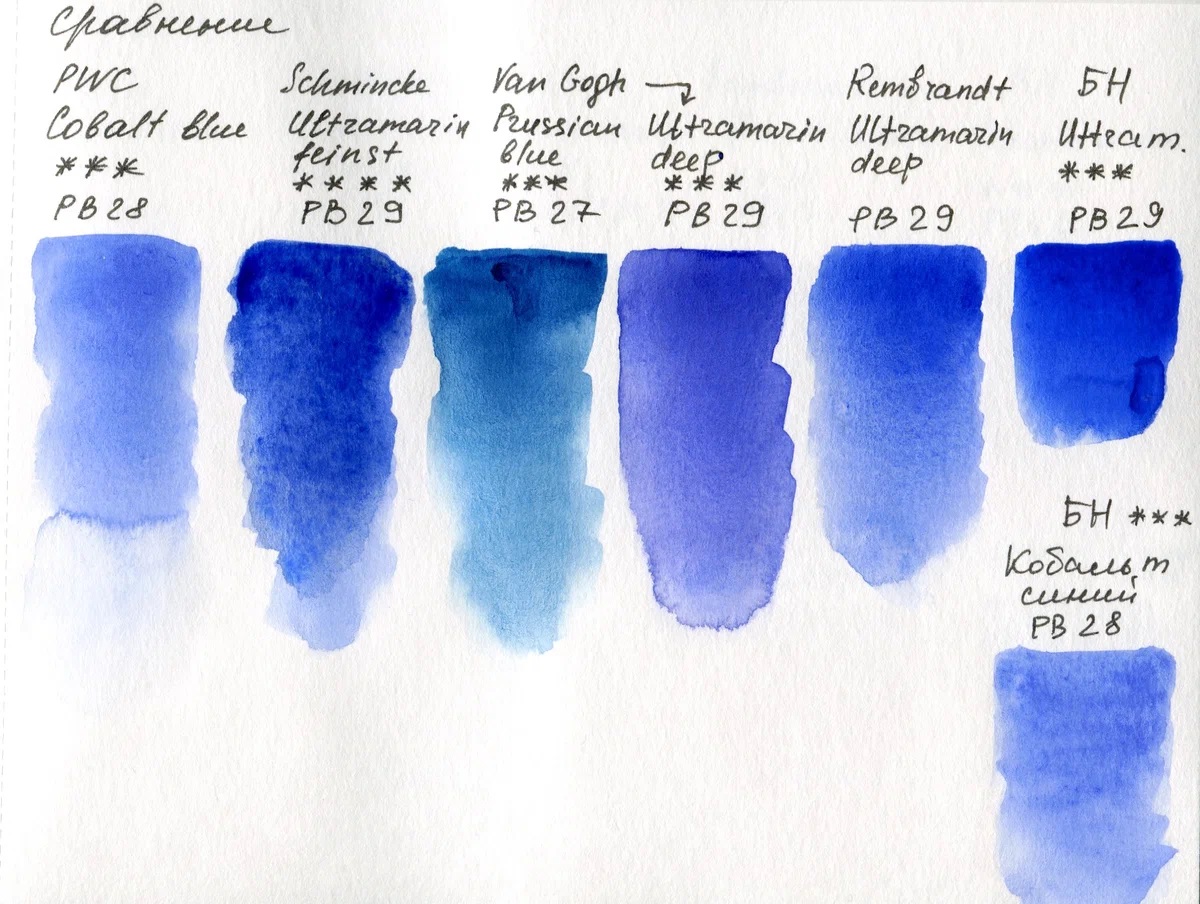 Удивилась приятному нанесению и равномерностью у PWC. На этом же пигменте кобальт синий у «Белых ночей». Например, в стареньком наборе «Белых ночей» он тоже светлый, но не такой однородный (хотя наскрести его из полупустой кюветы оказалось трудной задачей). У остальных марок у меня только ультрамарин, так как я наиболее часто им пользуюсь. Они на одном пигменте PB29, но немного отличаются. На выкраске видно, что варьируется не только оттенок, но и глубина цвета.