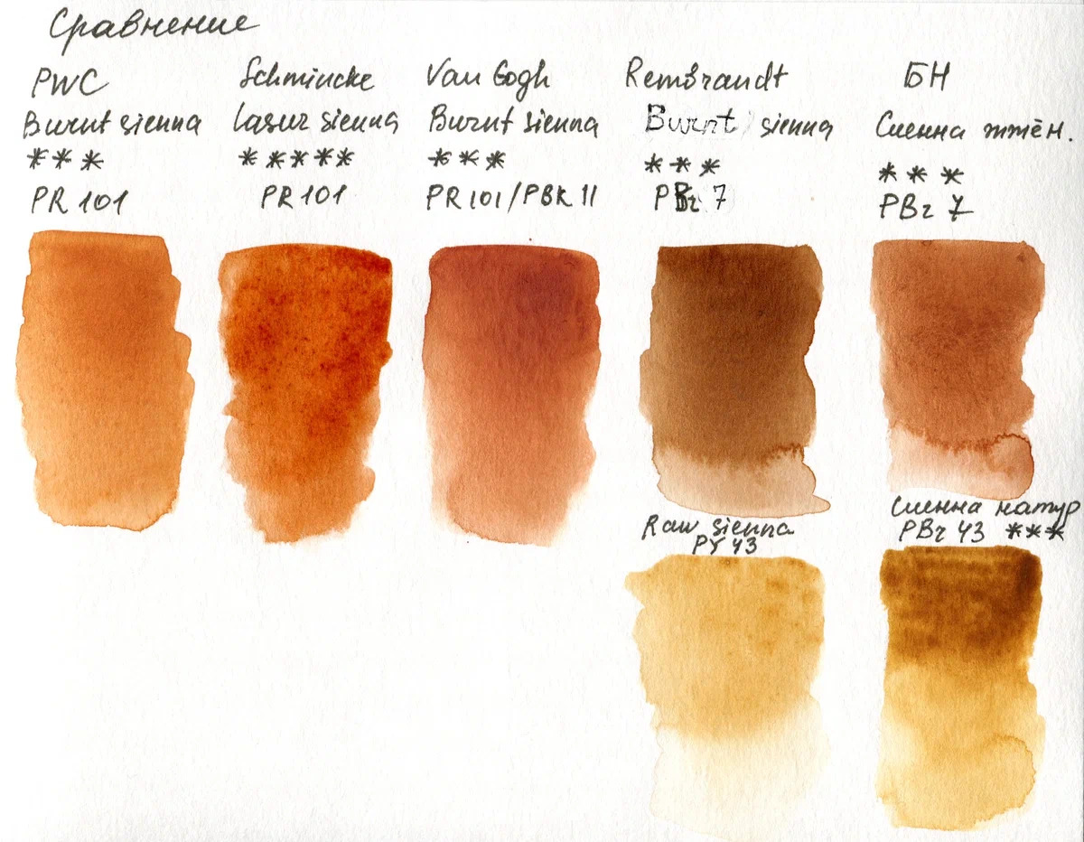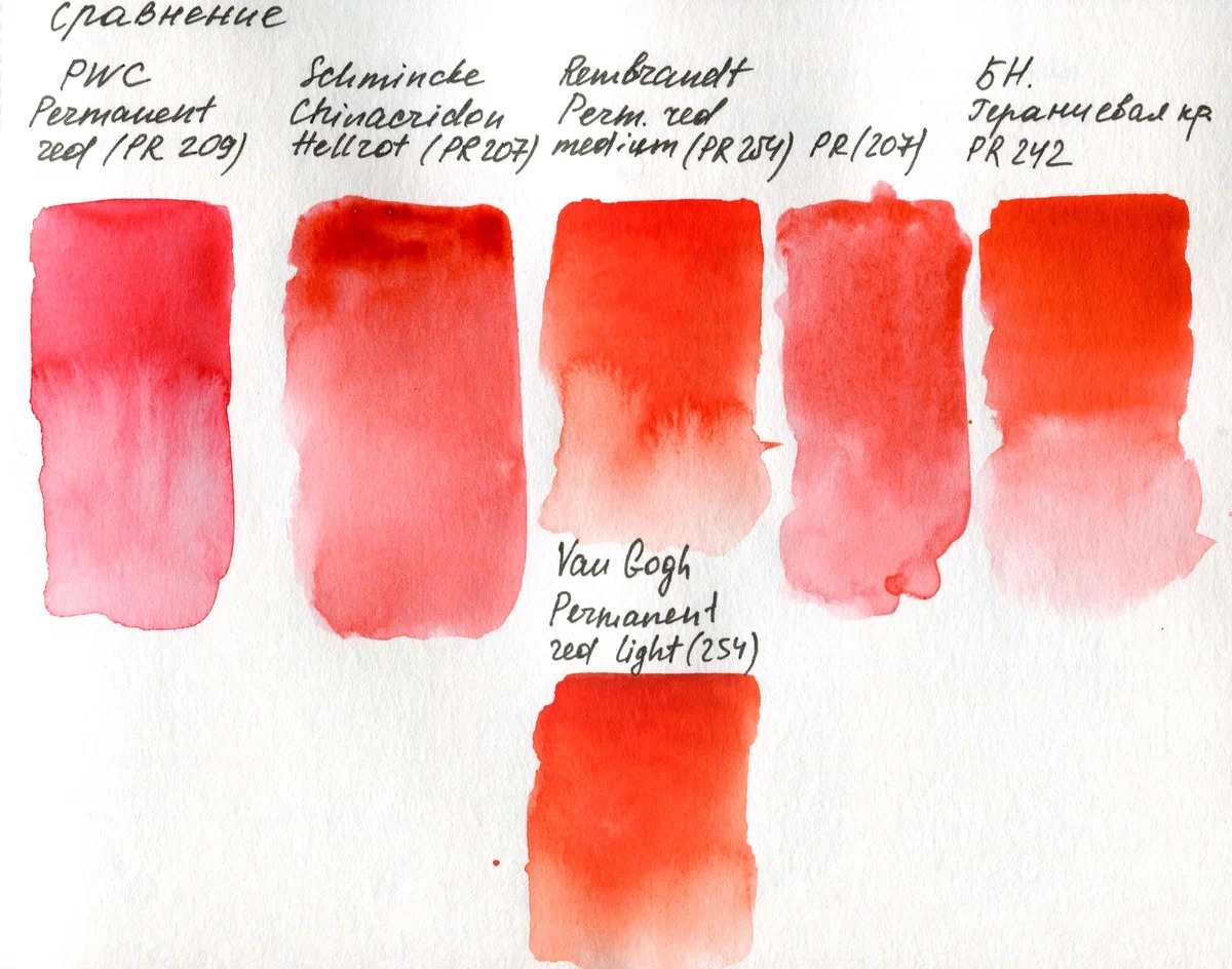 Не во всех наборах она у меня оказалась, поэтому сравниваю ещё и с натуральной. Здесь тоже расхождение в пигментах. PWC и Schmincke на одном пигменте, но отличаются. У Schmincke выглядит плотнее и краснее. Van Gogh имеет тот же пигмент в составе с добавлением PBk11, но он более приглушённый по сравнению со Schmincke.