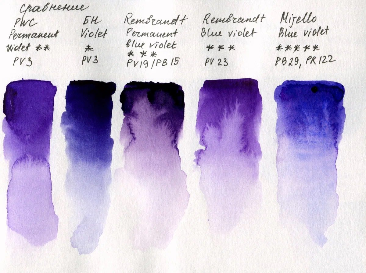 Люблю его абсолютно разный. У Mijello есть небольшая грануляция и распад двух пигментов, его совсем не заметно. У PWC и «Белых ночей» фиолетовый на одном пигменте, но цвет разный. Так, в «Белых ночах» очень плотный, без размытия почти чёрный. Жаль только, что всего одна звезда светостойкости. PWC на этом же пигменте не такой плотный, имеет больше красноты, немного похож на Rembrandt blue violet, и звезды уже две.
