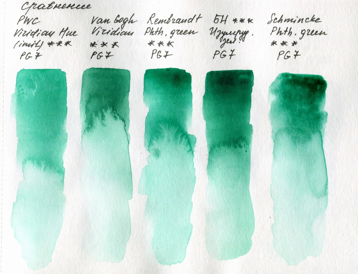 Пигмент у всех вышеперечисленных марок один — PG7. Консистенция и плотность у всех разная. «Белые ночи» брала из кюветы, и на удивление она оказалась самая тёмная, даже из кюветы хорошо набиралась, но оттенок показался чуть глуше и плотнее, чем у остальных.