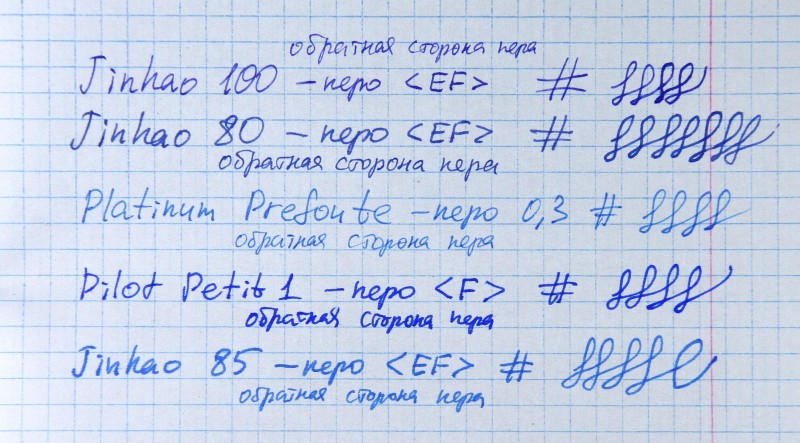 Вот сравнение письма с другими перьями по бумаге из дешёвой школьной тетради.