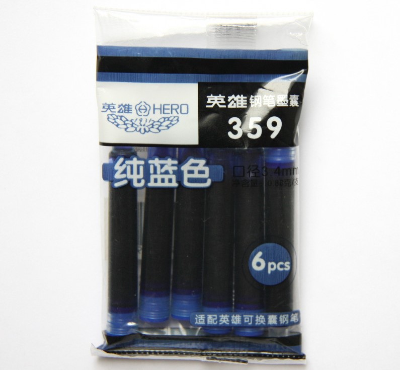 Китайцы выпускают свой стандарт, совместимый с International, объёмом не менее 1 мл (возможно, там больше), который называют Calibre 2,6 mm (встречал также Calibre 028 — те же 2,6 мм). Он подходит к большинству китайских ручек и продаётся под всеми известными брендами (Jinhao, Hero, Deli, Hongdian, Picasso и пр.). Обычно чернила в таких картриджах достаточно качественные — с насыщенными цветами и приемлемой водостойкостью.