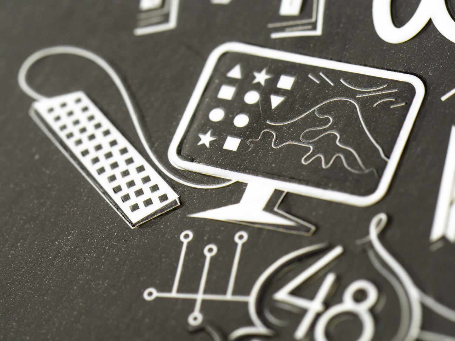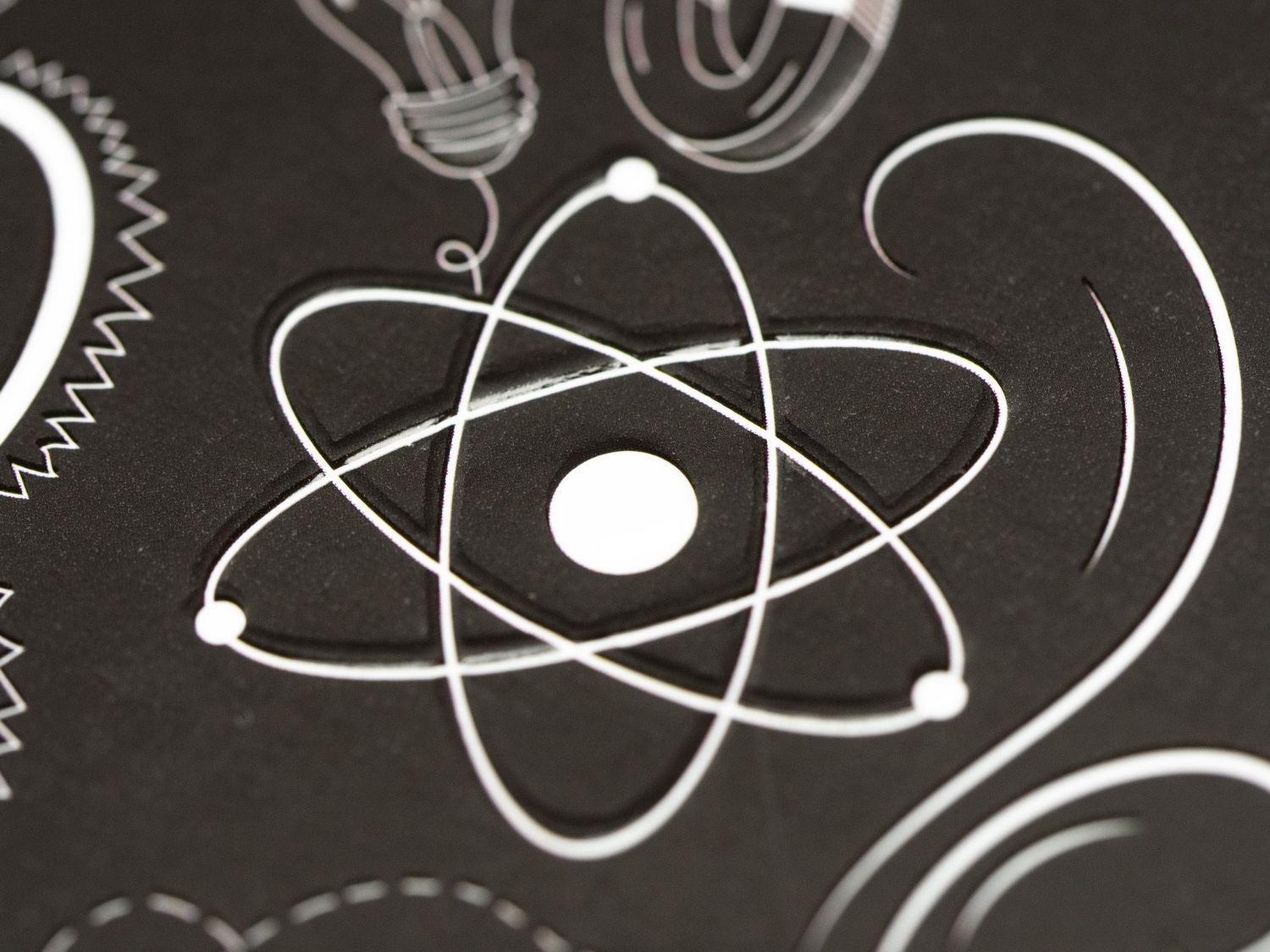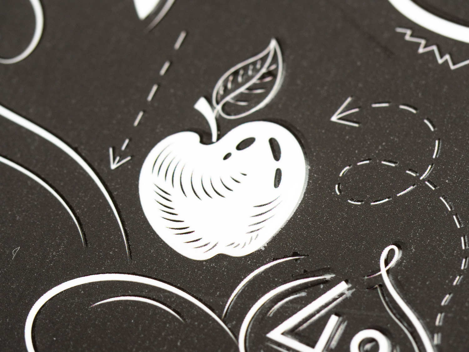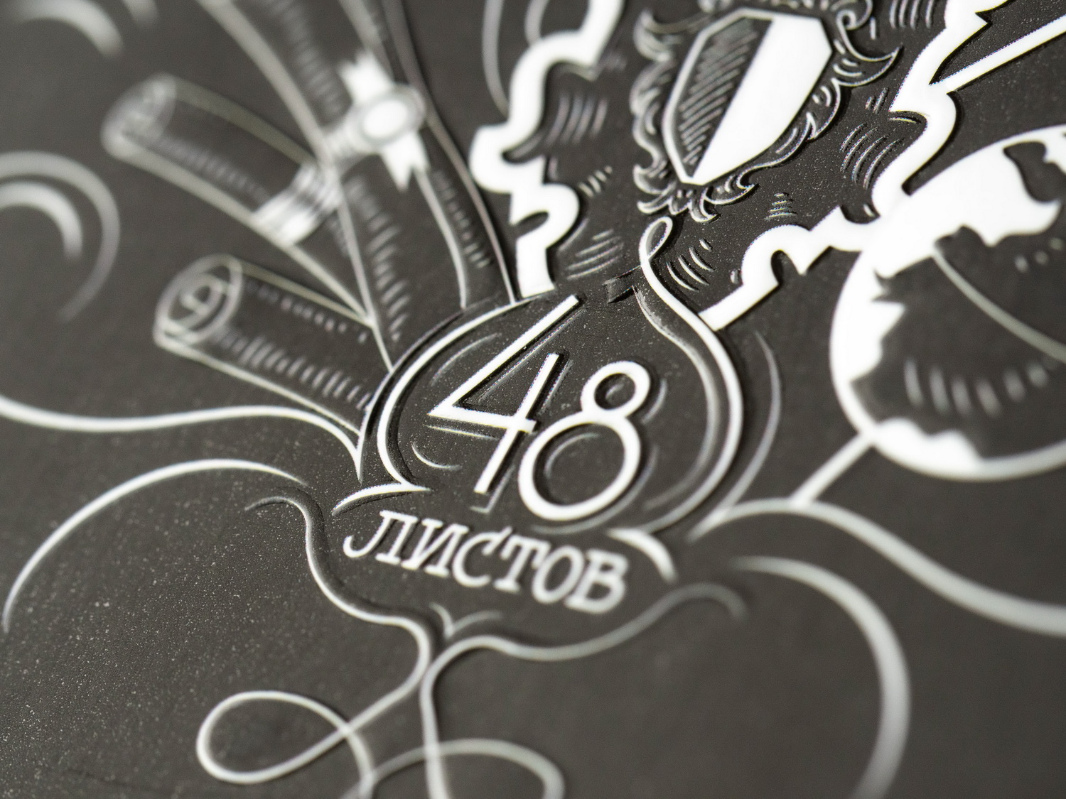 В этот раз меня уже было не обмануть. Я всё проверил. При производстве обложек тетрадей этой коллекции использовалась та же технология, что и в «Авокадиках» — ламинация матовой плёнкой: эффект резинового покрытия + стойкость к механическим воздействиям. А кроме этого ещё применили многоуровневое конгревное тиснение — рай кинестетиков, ведь все надписи, рисунки и элементы дизайна рельефные. Ну а сверху добавили выборочное УФ-лакирование — оно наносится на белые элементы и создаёт яркий контраст между ними и чёрным «резиновым» фоном доски-обложки.