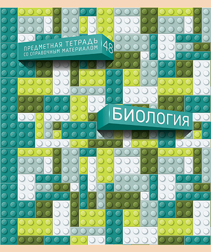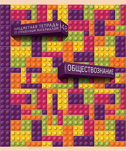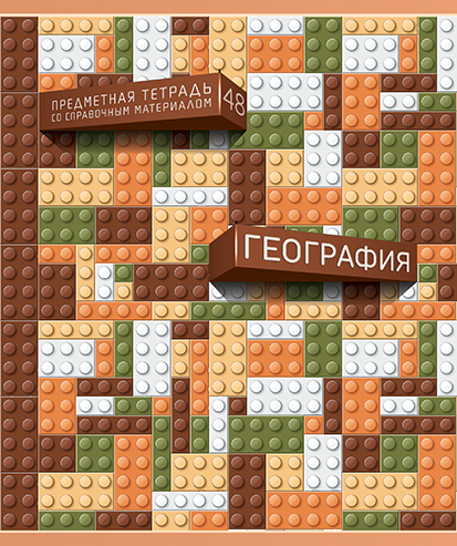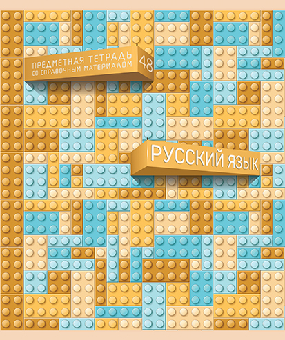 Композиция на лицевой стороне обложки построена таким образом, будто из общего ровного полотна конструктора выбивается блок, на котором указан предмет, а ещё чуть выше второй — с указанием названия продукта «Предметная тетрадь со справочным материалом» и цифра 48, обозначающая количество листов в тетради.