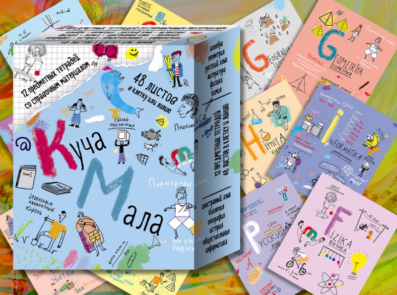 Именно так проще всего охарактеризовать происходящее на обложках этой коллекции тетрадей — куча-мала. Здесь название говорит само за себя: в хаотичном беспорядке напечатаны надписи, фразы, формулы, правила, условные обозначения, рисунки и графики. Неизменный атрибут на каждой обложке — пара мышек, хотел я написать, но при внимательном осмотре нашёл их только на шести из двенадцати предметов. На остальных шести — другая живность: птички, кошки, медведи, рыбы, простейшие, слоны… На двух вообще живности нет, если не считать людей. Иллюстрации готовила уже известная нам по серии выше художница Евгения Даменцева.