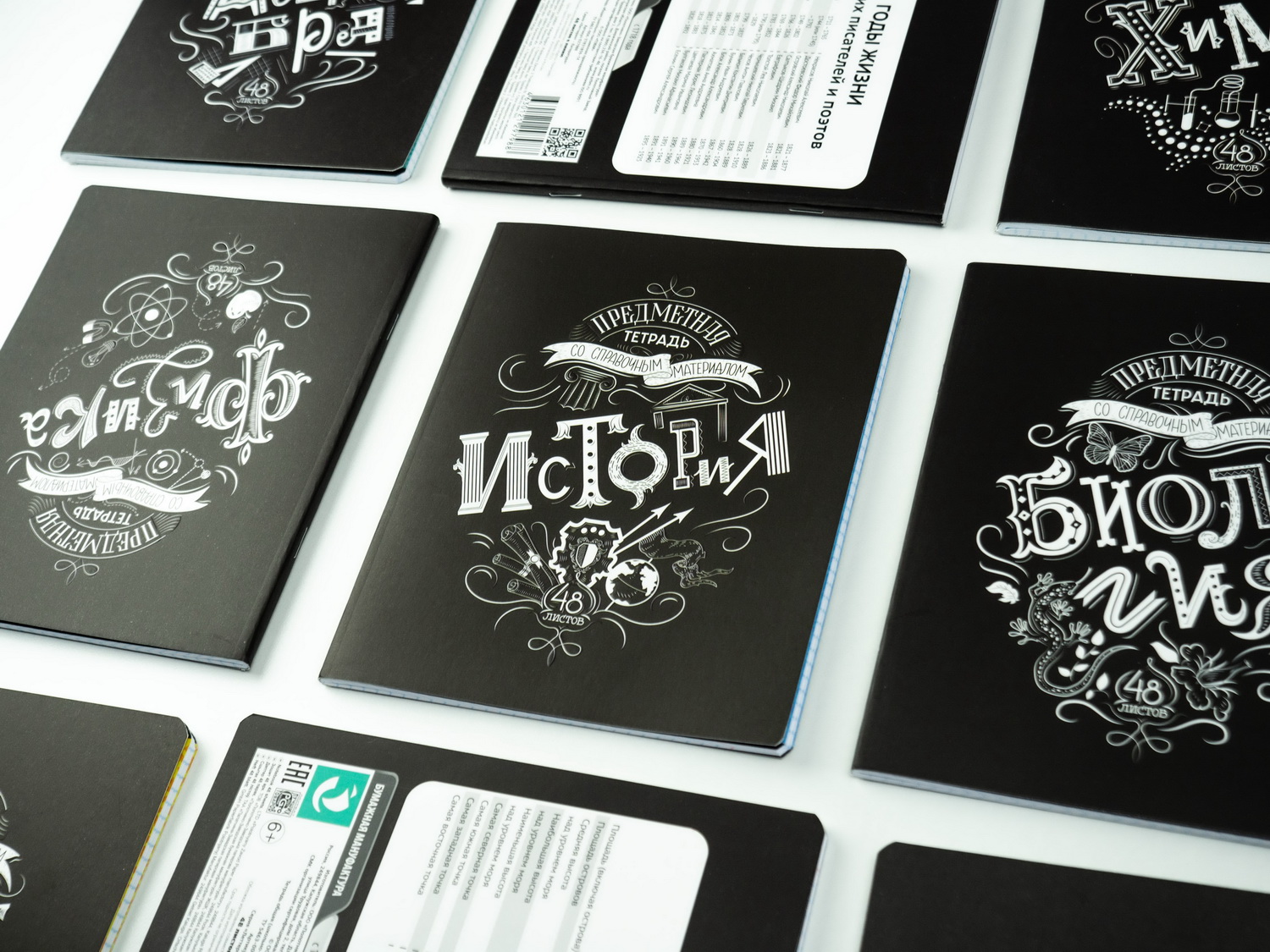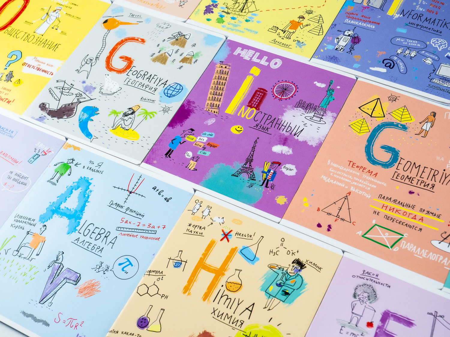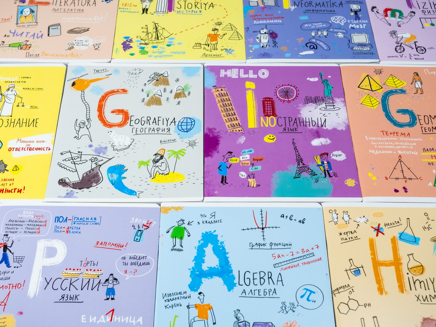 Так же, как и у всех предыдущих линеек предметных тетрадей, у «Леттеринга» тоже 12 предметов: алгебра, английский язык, биология, география, геометрия, информатика, история, литература, обществознание, русский язык, физика и химия доступны для покупки поштучно.