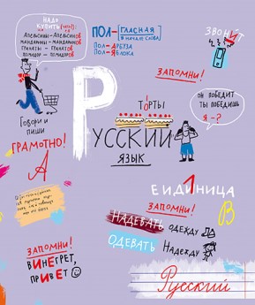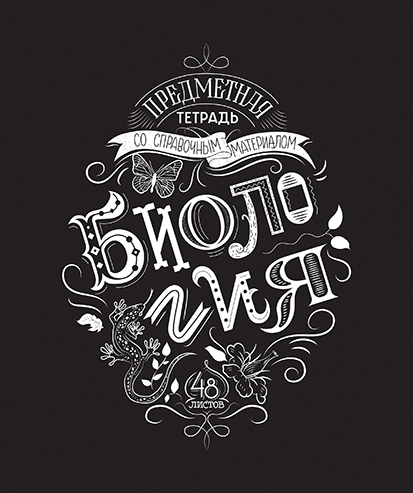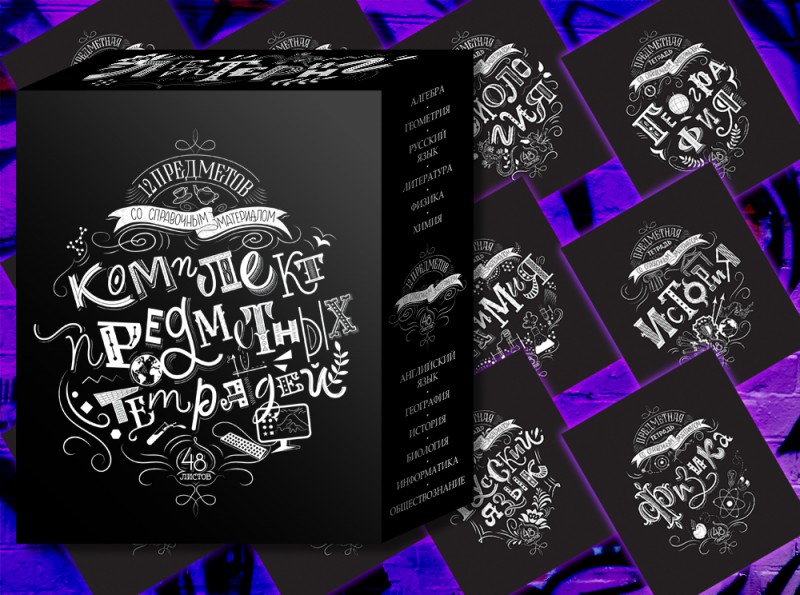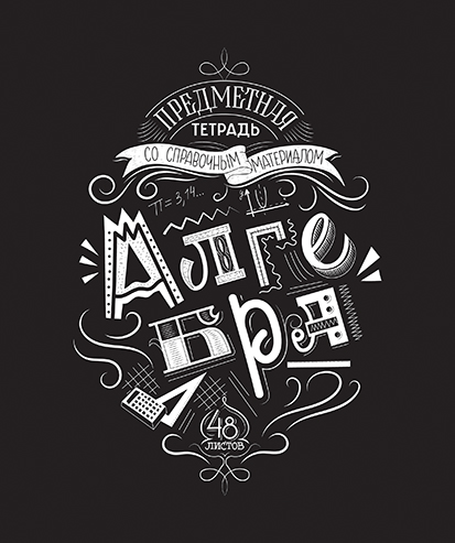 Фон обложки тетради полностью чёрный, как та самая меловая доска. А поверх неё будто нарисованы белым мелом названия предметов и характерные им элементы дизайна, как например двухэтажный автобус на тетради по английскому языку, чернильница с перьями — на литературе или моноблок с клавиатурой — на информатике. Так же нарисовано наименование продукта «Предметная тетрадь со справочным материалом» и указано количество листов — 48. При этом всё удачно вписано в концепцию обложки, нет ощущения нагромождённости — всего достаточно: стильно и лаконично.