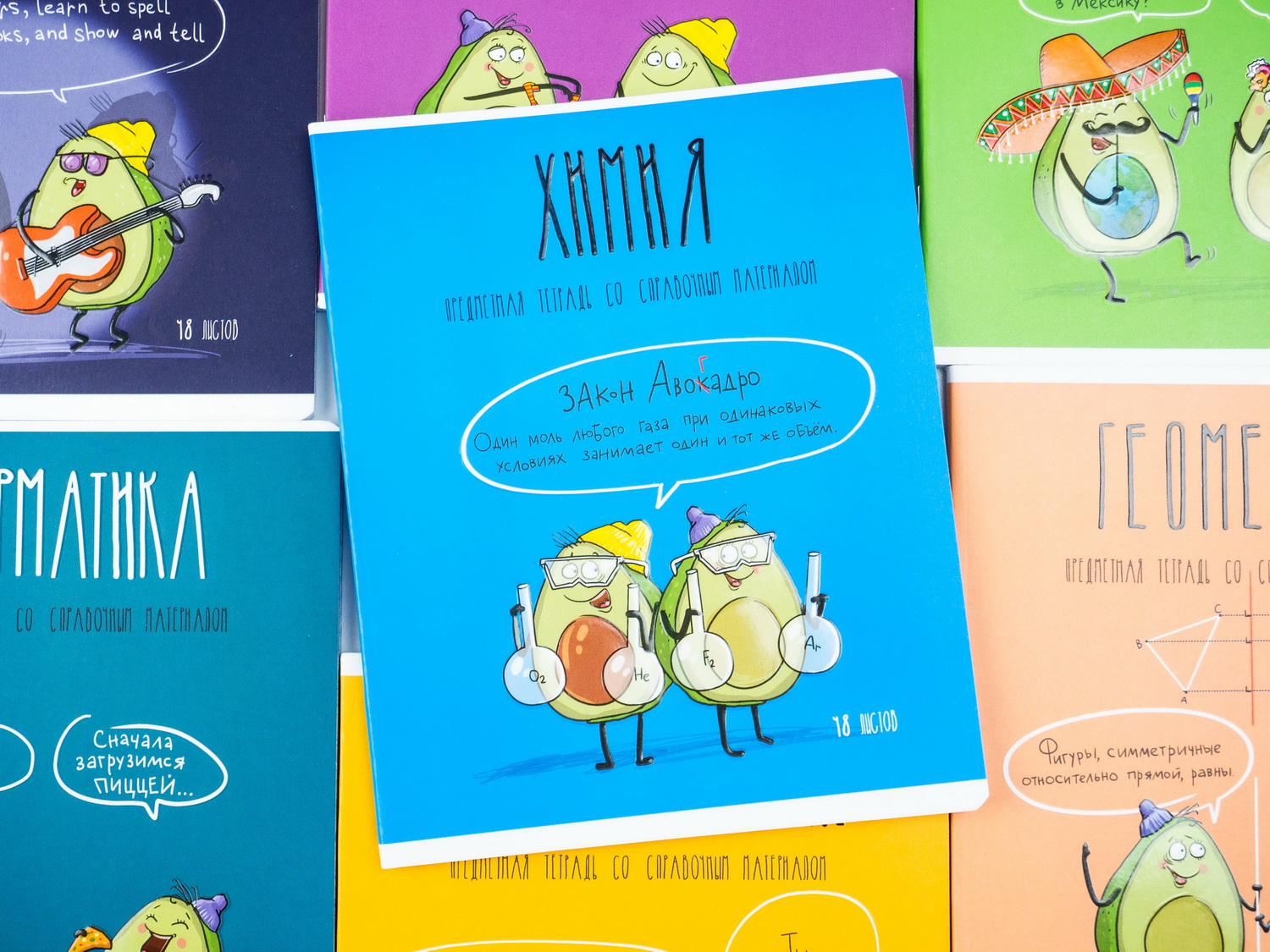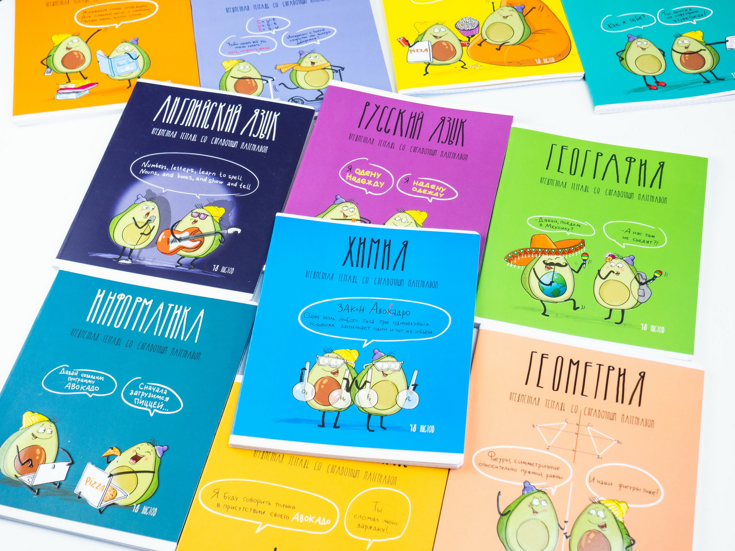 В серии «Авокадики» 12 предметов: алгебра, английский язык, биология, география, геометрия, информатика, история, литература, обществознание, русский язык, физика и химия доступны для покупки поштучно.