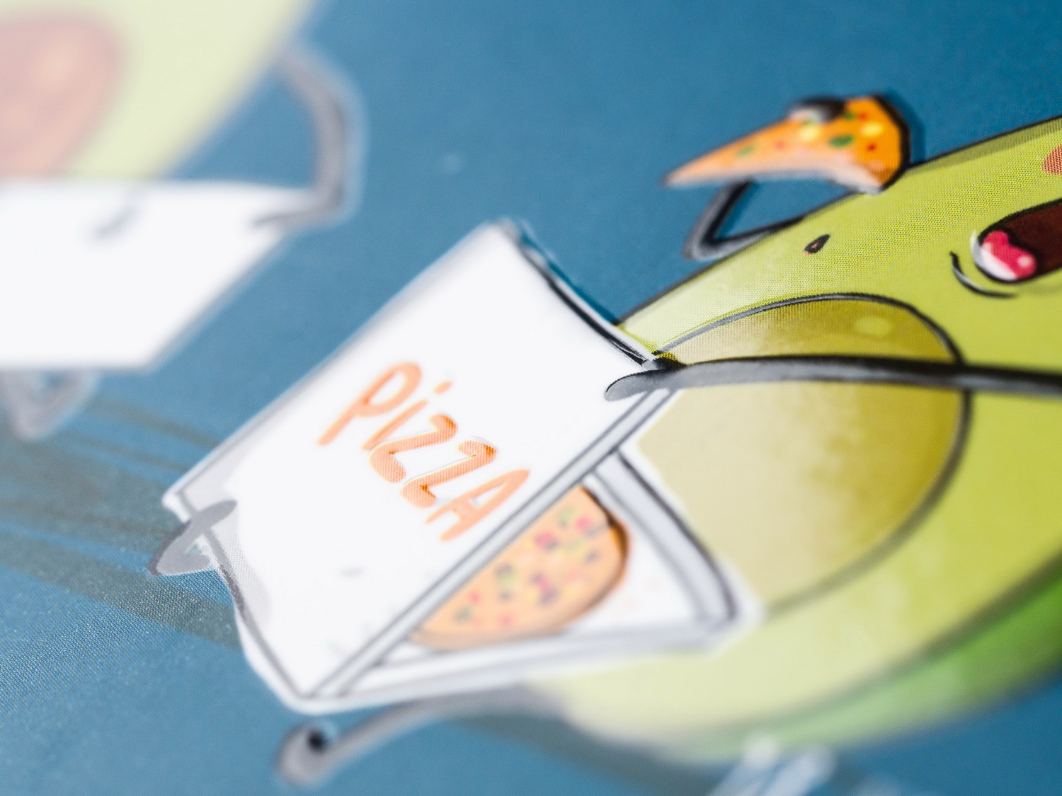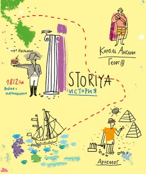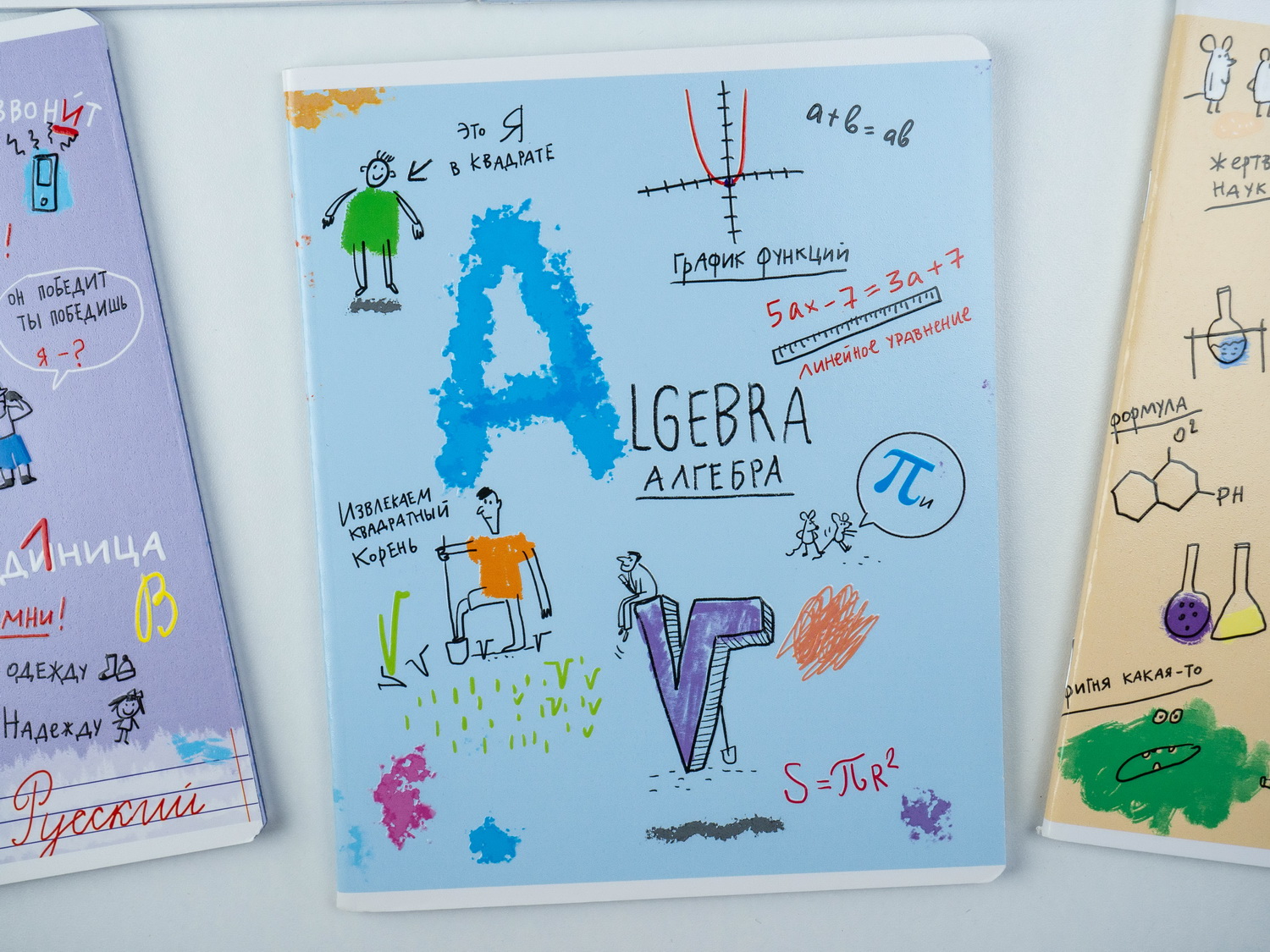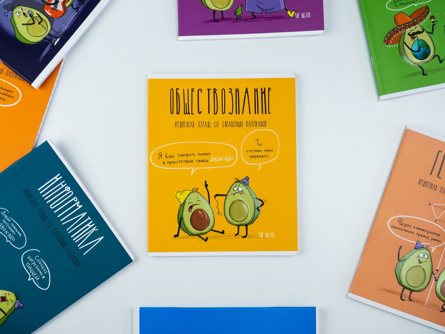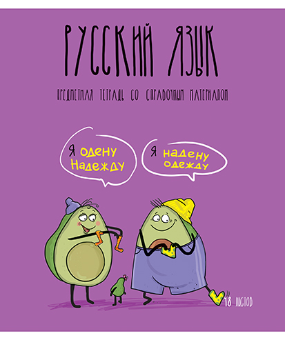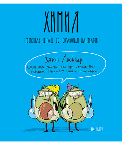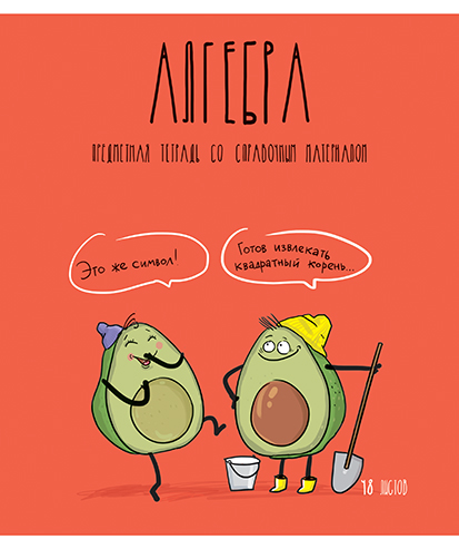 На лицевую сторону обложки тетради нанесены название предмета, описание продукта, а под надписями — комикс-сценка из жизни пары авокадиков, относящаяся к изучаемому предмету.