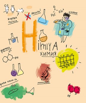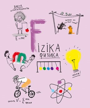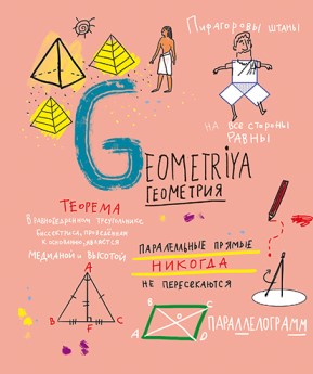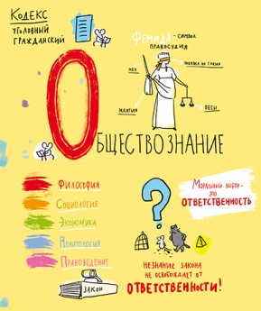 На лицевой стороне обложки, в центре, оригинальная надпись — название изучаемой дисциплины в основном на двух языка: на русском и дублируется… э-э-э, на транслите. Ну и все хаотично расположенные элементы дизайна так или иначе относятся к предмету, будь то инфузория-туфелька — биология, или Фемида на обществознании. Тем не менее смотрится всё в тему.