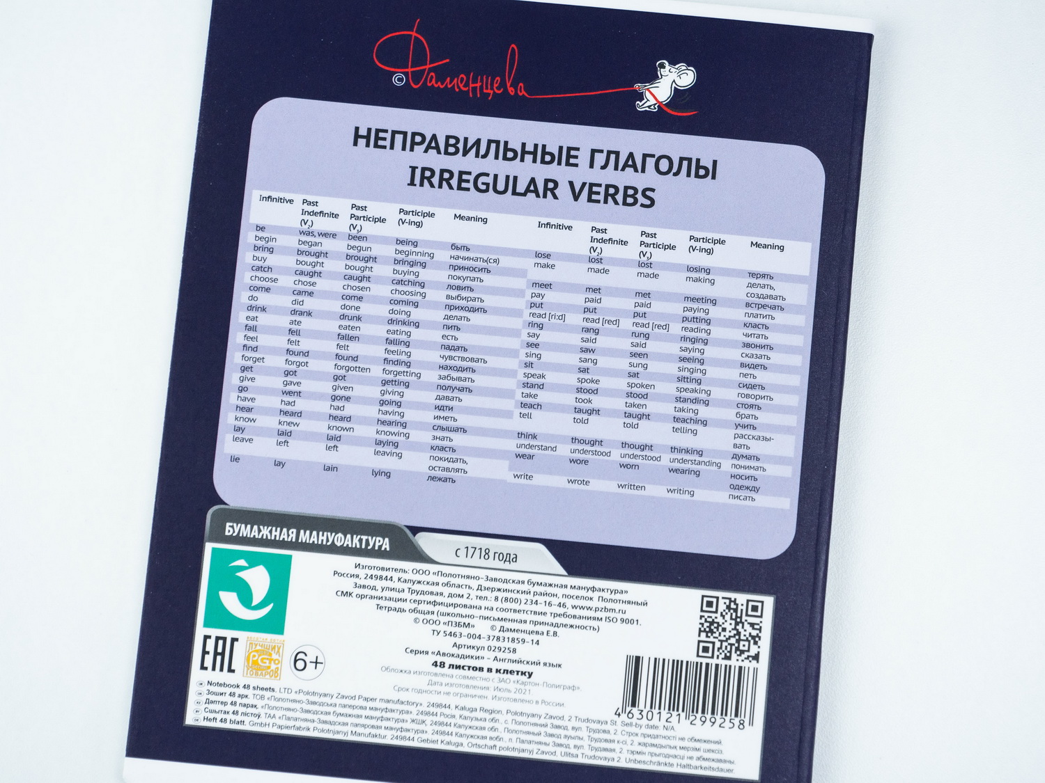 На обратной стороне обложки тетради напечатан небольшой справочный материал, который, по мнению создателей, может пригодиться школьнику в первую очередь, а также техническая информация, штрих- и QR-коды продукта.