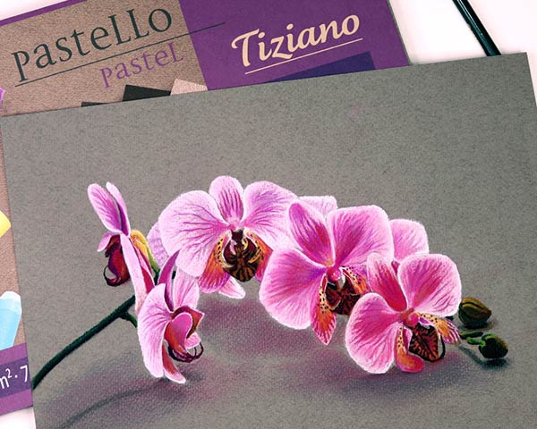 Сухая пастель в мелках средней мягкости прекрасно ложится на поверхность Tiziano — не пылит, не осыпается и не собирается в сугробы. Мягкие пастельные карандаши, такие как Stabilo CarbOthello и Koh-i-noor Gioconda, тоже хорошо показывают себя на этой бумаге, а вот более сухие, такие как Faber-Castell Pitt Pastel, лучше использовать на абразивной бумаге.